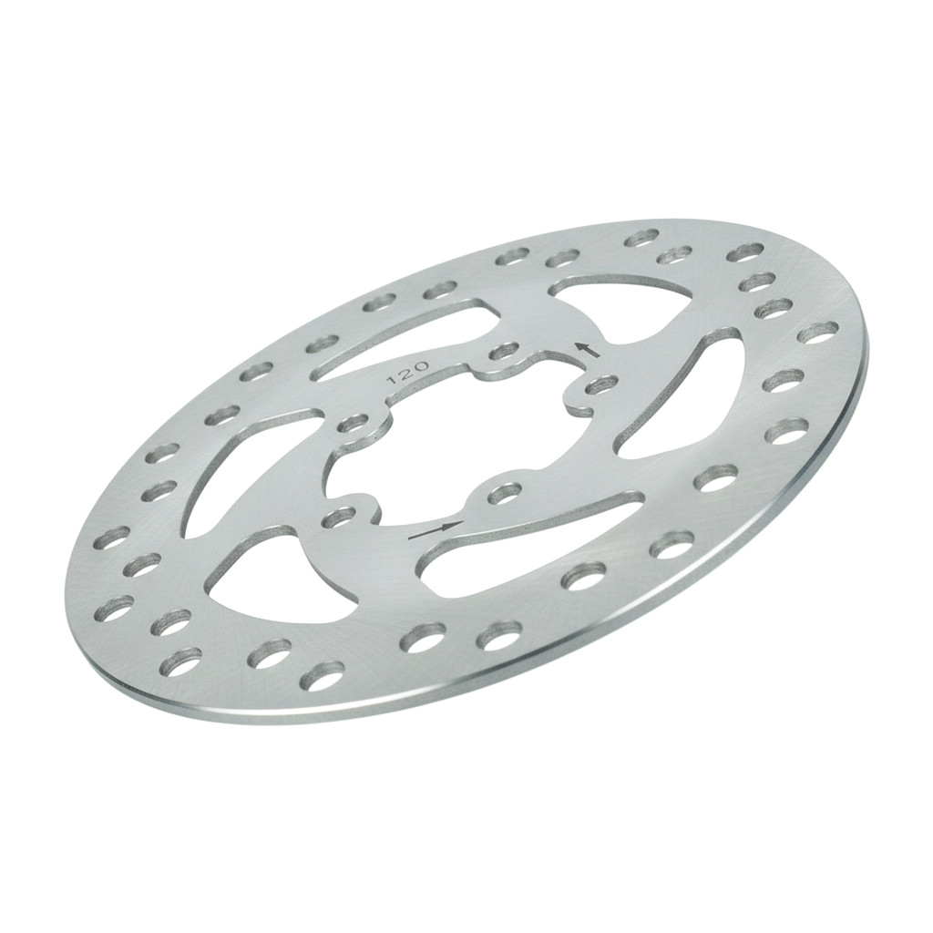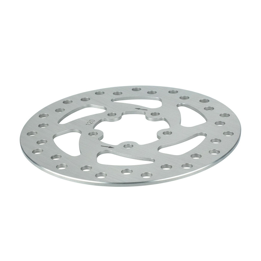 Тормозной ротор Zoom Type-A — компактное и надёжное решение, разработанное специально для детских велосипедов с малыми колёсами. Изготовлен из нержавеющей стали, устойчивой к коррозии и износу, что обеспечивает долгий срок службы даже при ежедневной эксплуатации в любых погодных условиях. Диаметр ротора — 120 мм, что делает его совместимым с втулками детских велосипедов, где не помещаются стандартные 140- или 160-мм роторы. Крепление осуществляется с помощью 5 болтов, обеспечивающих надёжную фиксацию и устойчивость при торможении. Серебристый цвет придаёт аккуратный и технологичный вид.