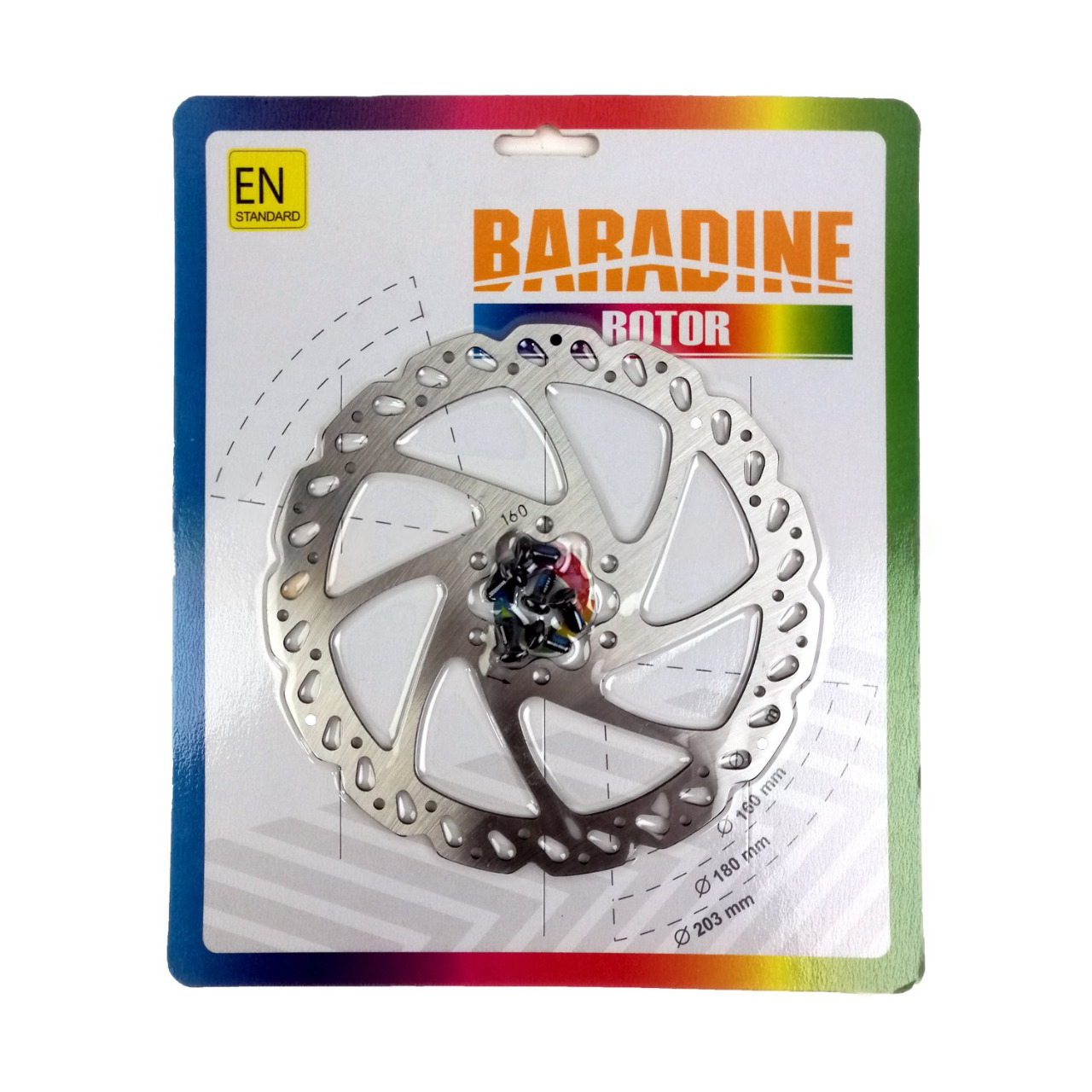 Тормозной ротор Baradine DB-01 — универсальное и надёжное решение для горных, туристических и городских велосипедов. Изготовлен из высококачественной нержавеющей стали, обеспечивающей отличную износостойкость, устойчивость к коррозии и стабильное торможение в любых погодных условиях. Диаметр ротора — 160 мм, что является наиболее распространённым размером, подходящим для широкого спектра дисковых механических и гидравлических тормозов. Крепление выполнено по стандарту 6 болтов (IS 6-bolt), комплект болтов входит в поставку. Ротор поставляется в фирменной упаковке — картонной подложке с блистером, что обеспечивает защиту при транспортировке и удобство хранения. Серебристый цвет подчёркивает технологичный внешний вид.