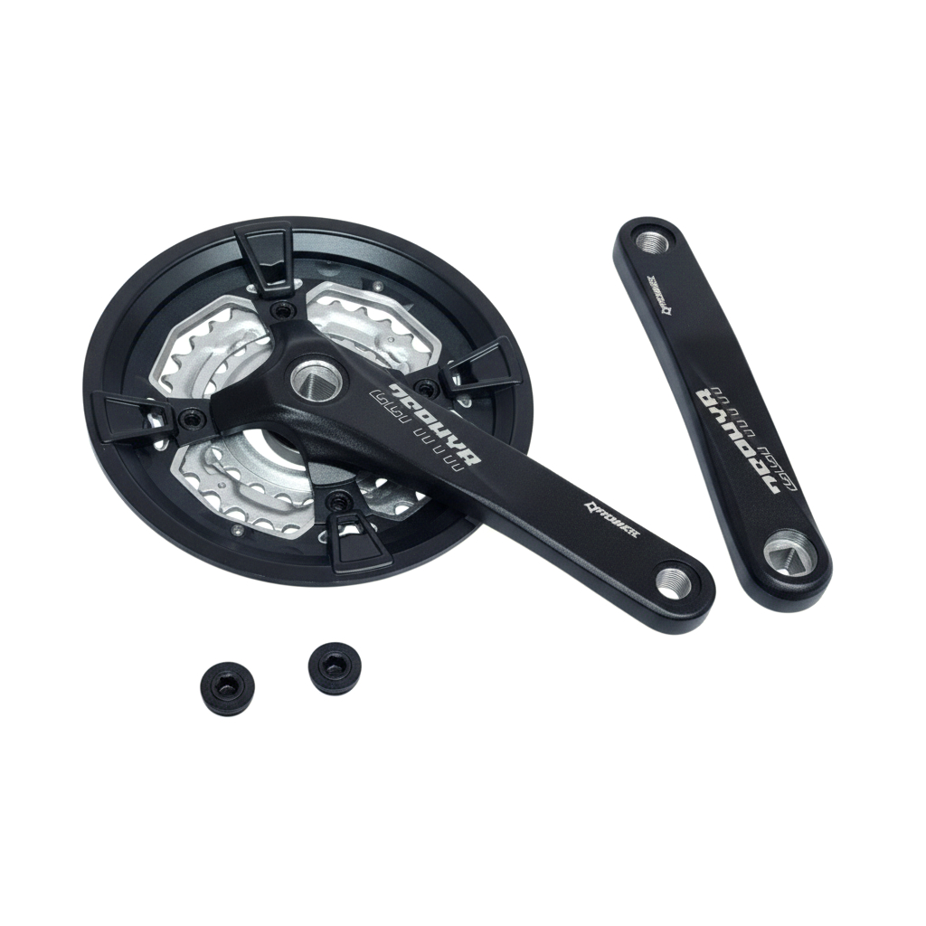 Система Prowheel Zephyr — современное и сбалансированное решение для горных и туристических велосипедов с трансмиссией 3×10 передач. Благодаря комбинации звёзд 24/32/44T она обеспечивает широкий диапазон передач, подходящий как для подъёмов, так и для скоростного катания. Шатуны длиной 170 мм изготовлены из алюминиевого сплава AL-6061-T6 методом ковки, что гарантирует высокую прочность при умеренном весе. Большая звезда на 44T дополнена пластиковой накладкой для снижения износа цепи и шума. Система совместима с каретками под квадратный шпиндель (вал длиной 113 мм), имеет BCD 104 мм, линию цепи 50 мм и Q-Factor 174 мм, обеспечивающий комфортное и эффективное педалирование.
