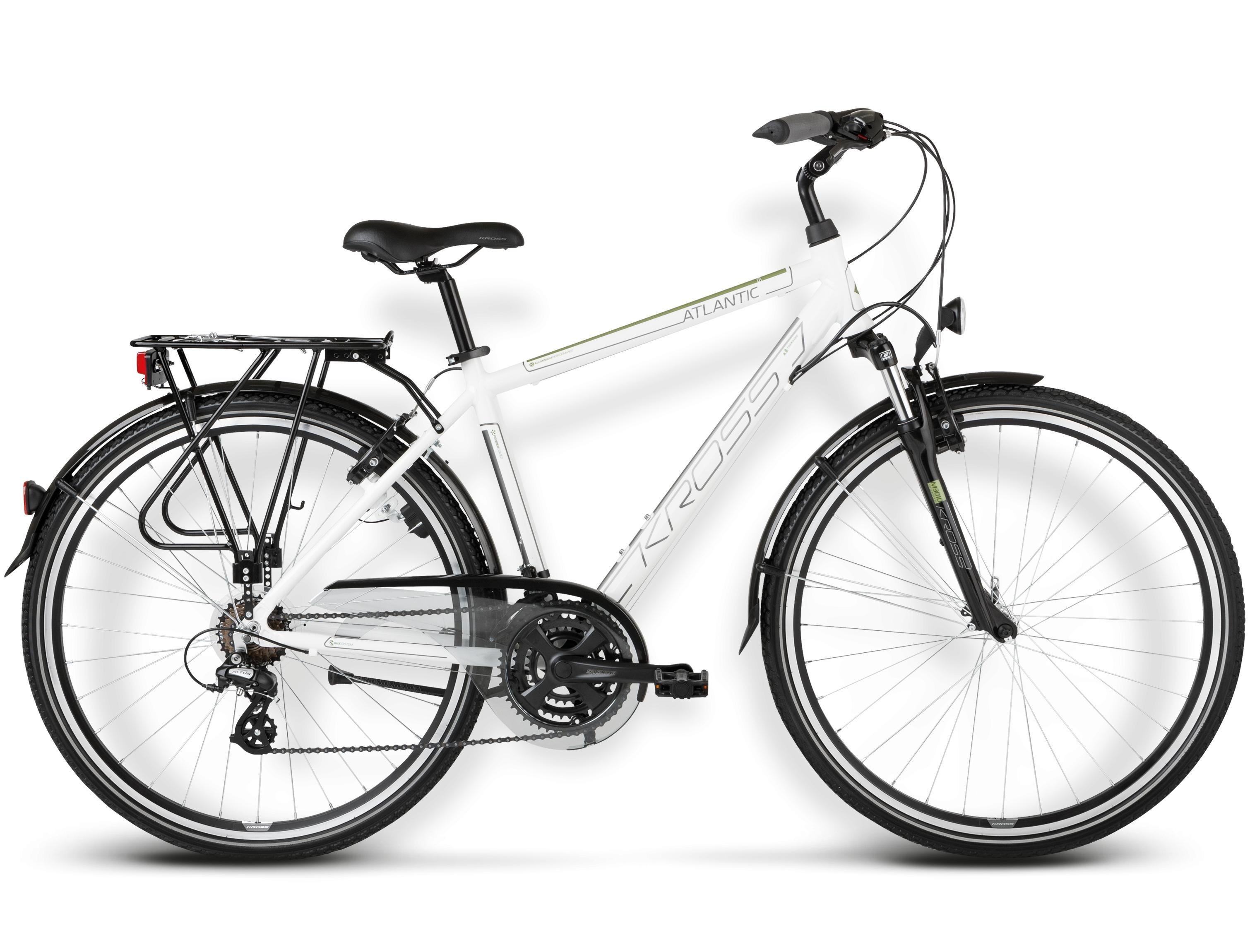Дорожный велосипед класса туринг с оборудованием любительского класса Shimano, 21 скорость. Технические особенности: алюминиевая рама Aluminium Performance, амортизационная вилка SR Suntour M3010, двойные обода Kross, надежные ободные тормоза Kross V-brake, длинные крылья, багажник, защита цепи, подножка, регулируемый вынос, передний и задний фонари. Подходит для туристического и прогулочного катания по шоссе и ровным проселочным дорогам. Диаметр колес - 28 дюймов. Вес - 16,56 кг.