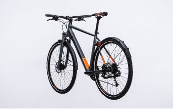 Дорожный велосипед гибридного типа с оборудованием предпрофессионального класса Shimano, 27 скоростей. Технические особенности: алюминиевая рама Aluminium Superlite, амортизационная вилка SR Suntour NEX HLO, двойные обода CUBE ZX20 Disc, дисковые гидравлические тормоза Tektro HD-M285, длинные стальные крылья, система освещения, подножка. Подходит для прогулочной езды по шоссе и несложной пересеченной местности. Диаметр колес - 28 дюймов. Вес - 15,05 кг.
