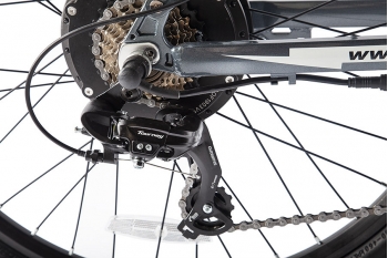 Переключает (перебрасывает) цепь на задних звездах. Принцип действия у всех одинаков — приводится в движение тросиком. Отличаются классом и производителем. Если рассматривать их взаимозаменяемость, то нужно учитывать следующие: параметры и диаметр крепежного хомута, его расположение (верхний или нижний), как подведен тросик (сверху или снизу переключателя, так называемая, тяга переключателя), а также количество зубьев на звездах. Регулировка заднего переключателя производится по тому же принципу что и регулировка переднего, однако здесь есть свои особенности. Так как данный тип оборудования достаточно обособлен от общей конструкции, некоторые велосипедисты устанавливают на ось специальную защитную скобу.