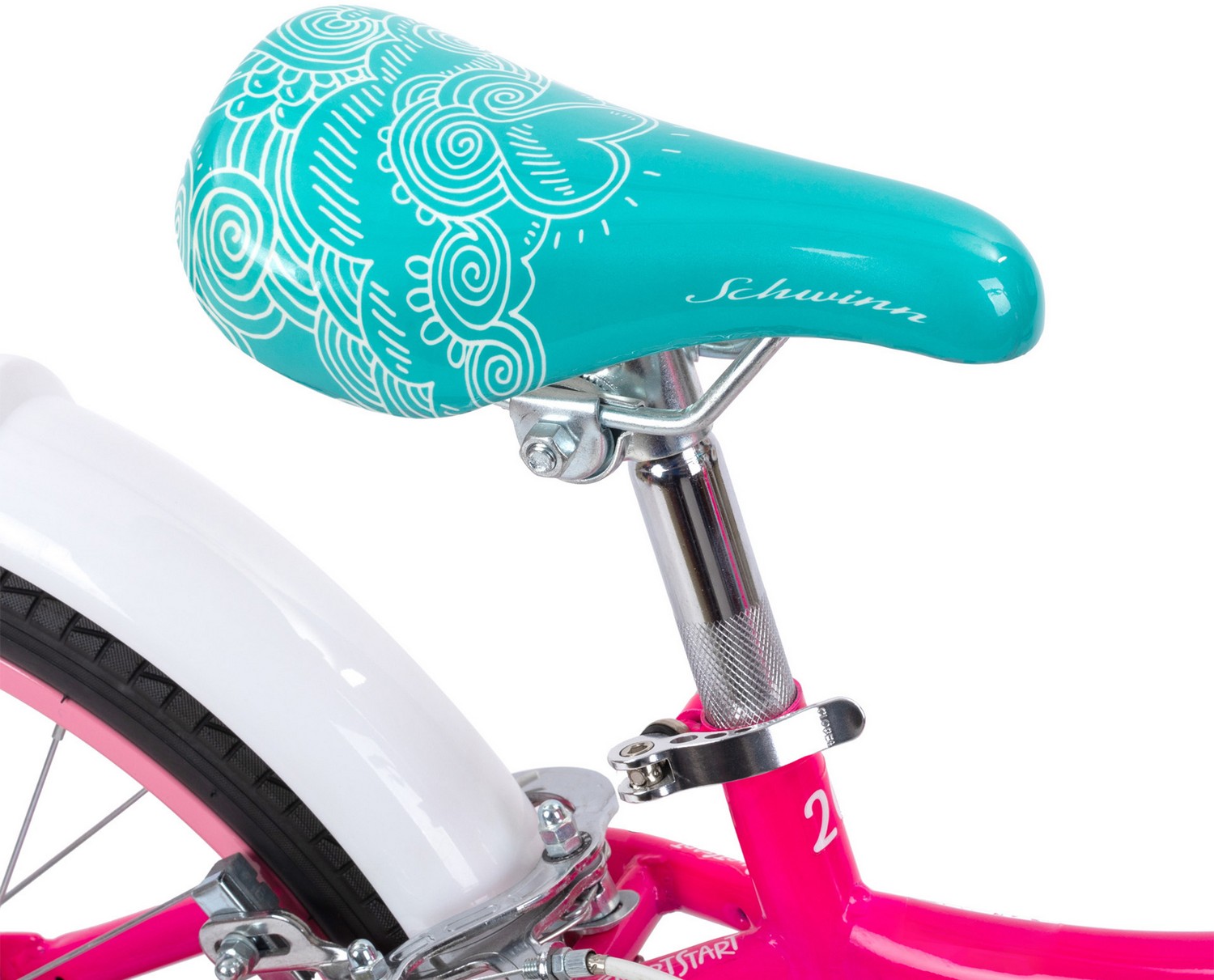 Велосипед, предназначенный для девочек в возрасте от пяти до девяти лет, без переключения передач. Технические особенности: стальная рама Schwinn Kids Smart Start, жесткая вилка Schwinn rigid steel, одинарные стальные обода, надежные ободные тормоза клещевого типа, съемные боковые колеса, защита цепи, крылья, мягкая накладка на руле, подножка. Подходит для обучения и прогулочного катания в городских условиях. Диаметр колес - 20 дюймов. Вес - 11,5 кг.