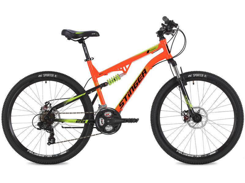 Двухподвес начального уровня с навесным оборудованием Shimano, 18 скоростей. Технические особенности: прочная стальная рама Hi-Ten, амортизационная вилка Stinger SF-100 с ходом 60 мм, задний амортизатор, двойные обода Felgebeiter VB-18D, дисковые механические тормоза STG Disc, подножка. Подходит для прогулочного катания по различным дорогам и пересеченной местности. Диаметр колес - 26 дюймов. Вес - 17,9 кг.