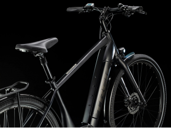 Дорожный электровелосипед с оборудованием высшего любительского класса Shimano, 9 скоростей. Технические особенности: алюминиевая рама Alpha Platinum Aluminum, жесткая алюминиевая вилка, двойные обода Bontrager Connection, дисковые гидравлические тормоза Shimano MT200, электромотор Bosch Active Plus (250 watt 50 Nm 20mph or 32km/h), батарея Bosch PowerTube 500, велокомпьютер Bosch Purion длинные крылья, подножка, багажник, защита цепи, система освещения. Подходит для активной езды по различным дорогам и пересеченной местности. Диаметр колес - 28 дюймов. Вес - 24.69 кг.