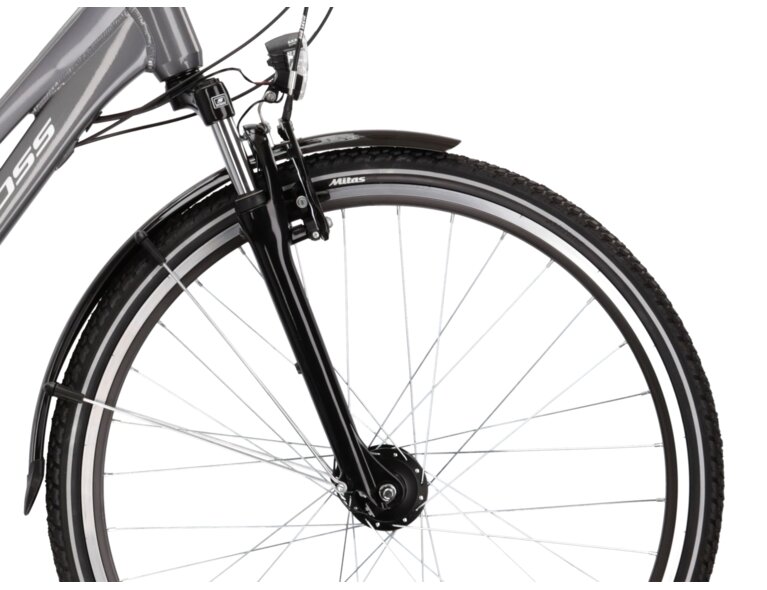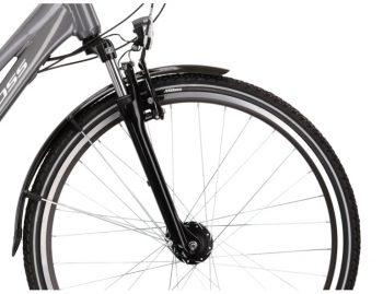 Женский туристический велосипед с оборудованием любительского класса Shimano, 21 скорость. Технические особенности: алюминиевая рама Aluminium Performance, амортизационная вилка SR Suntour M3010, двойные обода Kross, надежные ободные тормоза, длинные крылья, багажник, система освещения, подножка, звонок. Подходит для туристического и прогулочного катания по шоссе и ровным проселочным дорогам. Диаметр колес - 28 дюймов. Вес - 17 кг.