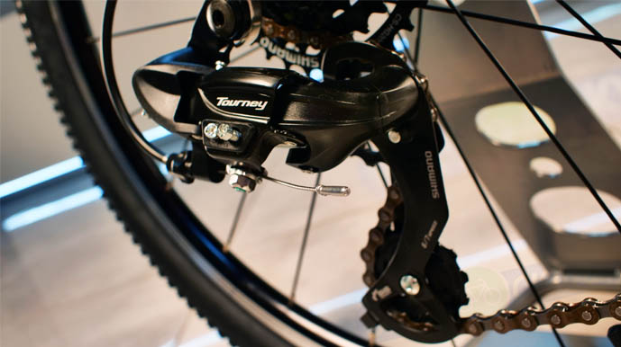 Переключает (перебрасывает) цепь на задних звездах. Принцип действия у всех одинаков — приводится в движение тросиком. Отличаются классом и производителем. Если рассматривать их взаимозаменяемость, то нужно учитывать следующие: параметры и диаметр крепежного хомута, его расположение (верхний или нижний), как подведен тросик (сверху или снизу переключателя, так называемая, тяга переключателя), а также количество зубьев на звездах. Регулировка заднего переключателя производится по тому же принципу что и регулировка переднего, однако здесь есть свои особенности. Так как данный тип оборудования достаточно обособлен от общей конструкции, некоторые велосипедисты устанавливают на ось специальную защитную скобу.
