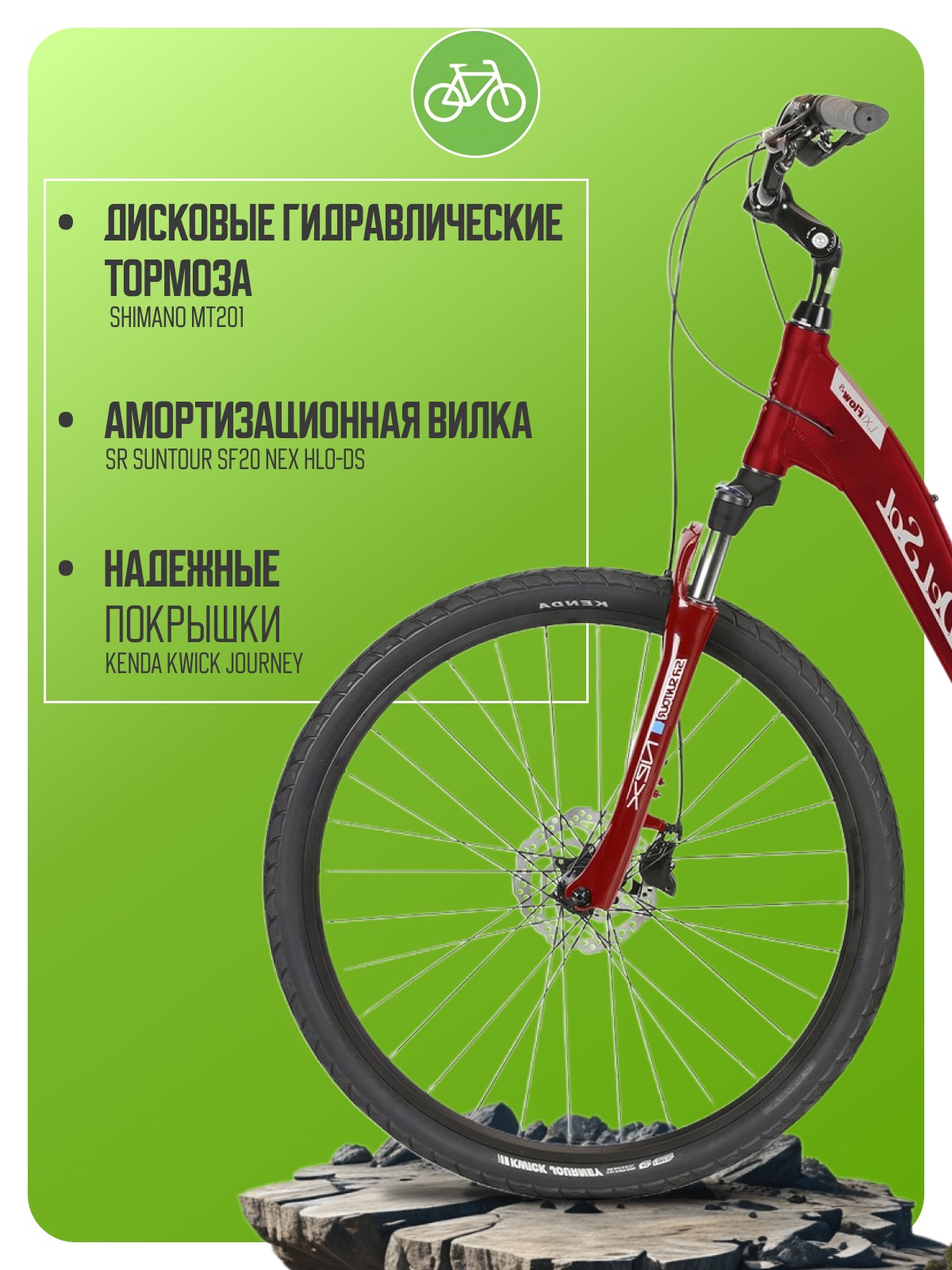 Комфортабельный женский велосипед с оборудованием высшего любительского класса Shimano, 9 скоростей. Технические особенности: алюминиевая рама Heat-treated 6061 aluminum, амортизационная вилка SR Suntour SF20 NEX HLO-DS, двойные обода Double-Wall Alloy, дисковые гидравлические тормоза Shimano MT201, амортизированный подседельный штырь, регулируемый вынос, комфортное седло. Подходит для комфортного катания в городских условиях и по несложным маршрутам в лесу. Диаметр колес - 26 дюймов. Вес - 15,42 кг.