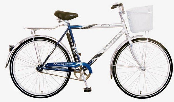 Дорожный велосипед для катания в городской среде, без переключения передач. Технические особенности: прочная стальная рама, жесткая стальная вилка, двойные алюминиевые обода (под AV ниппель), ножные педальные тормоза, защита цепи, длинные крылья с брызговиками, задний багажник, подножка, катафоты, звонок. Подходит для прогулочного катания в городских условиях и по несложным маршрутам в лесу. Диаметр колес - 26 дюймов. Вес - 16,1 кг.