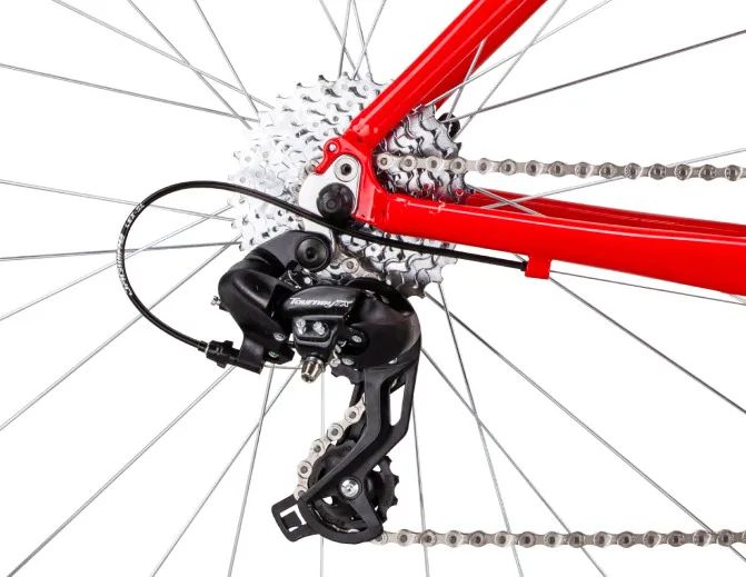 Переключает (перебрасывает) цепь на задних звездах. Принцип действия у всех одинаков — приводится в движение тросиком. Отличаются классом и производителем. Если рассматривать их взаимозаменяемость, то нужно учитывать следующие: параметры и диаметр крепежного хомута, его расположение (верхний или нижний), как подведен тросик (сверху или снизу переключателя, так называемая, тяга переключателя), а также количество зубьев на звездах. Регулировка заднего переключателя производится по тому же принципу что и регулировка переднего, однако здесь есть свои особенности. Так как данный тип оборудования достаточно обособлен от общей конструкции, некоторые велосипедисты устанавливают на ось специальную защитную скобу.