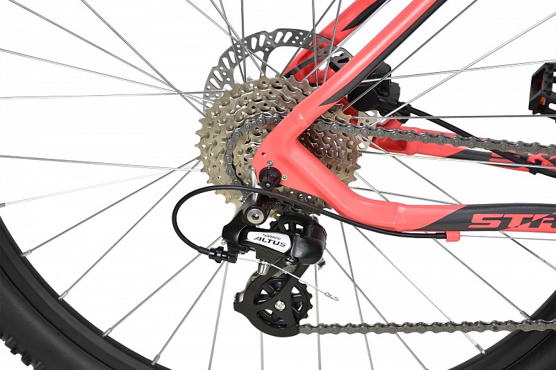 Система переключения: Оборудование начального класса Shimano с 8 скоростями предлагает широкий диапазон передач для легкости управления на любых участках трассы.