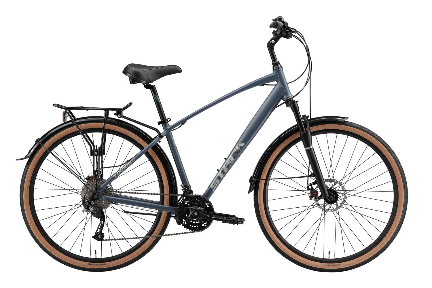 Городской велосипед с оборудованием начального любительского класса Shimano, 27 скоростей. Технические особенности: алюминиевая рама (сплав AL-6061, внутренняя проводка тросов), амортизационная вилка Grinz Campus SL (пружинно-масляная, ход 100 мм, предварительная нагрузка, блокировка), двойные алюминиевые обода Qijian DA-20 (под ниппель Presta), дисковые механические тормоза Repute DSC910 (роторы 160/160 мм), длинные крылья, багажник, подножка, звонок, регулируемый вынос. Подходит для туристического и прогулочного катания по шоссе и ровным проселочным дорогам. Диаметр колес - 28 дюймов. Вес - 15,5 кг.