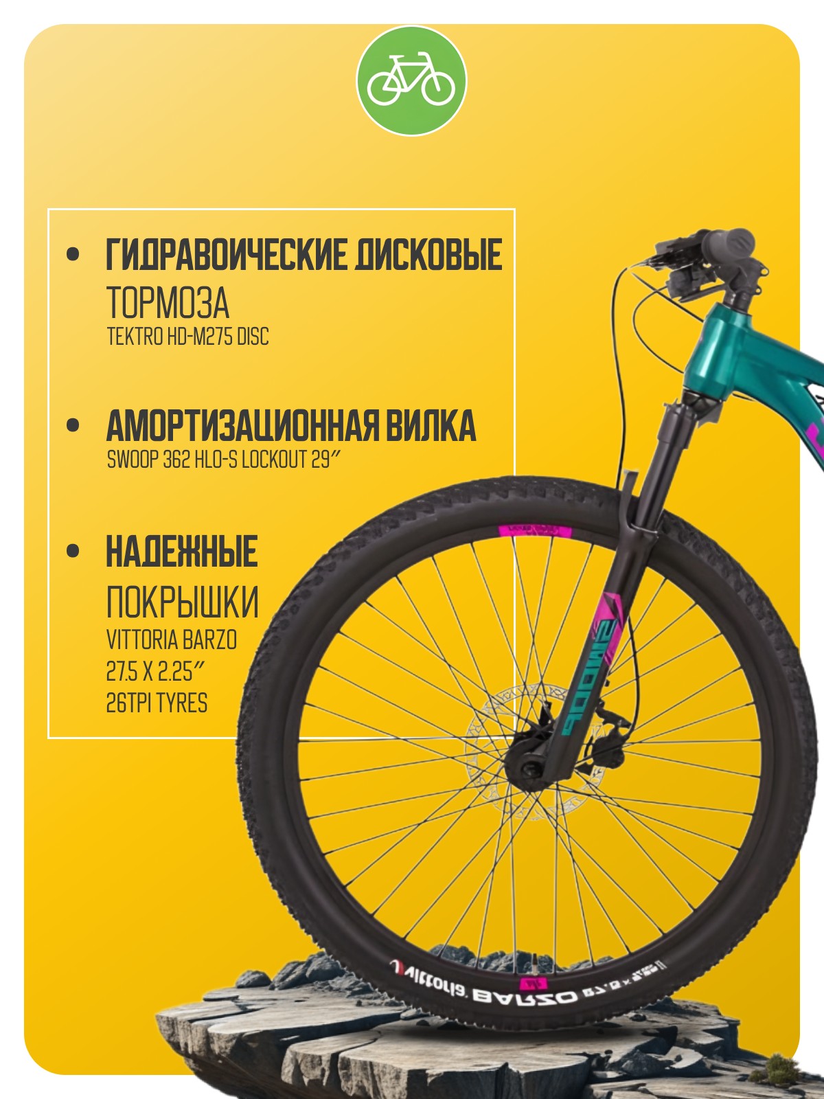 Женский горный велосипед с оборудованием любительского класса Microshift, 8 скоростей. Технические особенности: алюминиевая рама Rogue Ladies 6061 Alloy 650B Frame, амортизационная вилка Swoop 362 HLO-S (пружинно-эластомерная, гидравлическая блокировка, ход 100 мм), двойные алюминиевые обода TR MD16 36H, дисковые гидравлические тормоза Tektro HD-M275 (роторы 180/160 мм). Подходит для активной езды по различным дорогам и пересеченной местности. Диаметр колес - 27,5 дюймов. Вес - 13,8 кг.