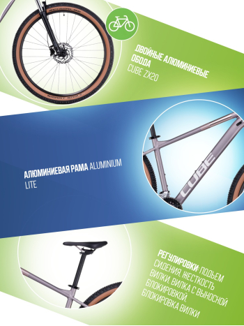 Женский горный велосипед с оборудованием любительского класса Shimano, 18 скоростей. Технические особенности: алюминиевая рама Aluminium Lite (гидроформинг, двойной баттинг, внутренняя проводка, крепления для подножки), амортизированная вилка SR Suntour XCM Disc (пружинно-эластомерная, ход 100 мм, удаленная блокировка с руля), двойные алюминиевые обода CUBE ZX20, дисковые гидравлические тормоза Shimano BR-MT200/UR300 (роторы 160/160 мм). Подходит для активного катания по различным дорогам и пересеченной местности. Диаметр колес - 27,5 дюймов. Вес - 14,3 кг.