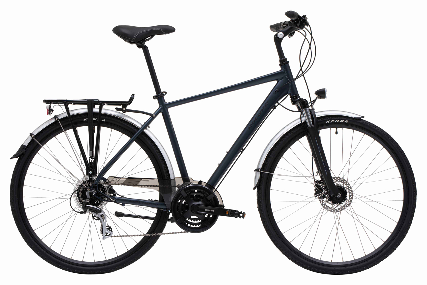 Дорожный велосипед класса туринг с оборудованием начального любительского класса Shimano, 24 скорости. Технические особенности: легкая алюминиевая рама (сплав 6061, городская геометрия, кареточный стакан BSA, рулевой стакан IS, съемный петух, частично скрытая прокладка тросов), амортизационная вилка RST Neon-T (пружинно-эластомерная, ход 60 мм, регулировка жесткости), двойные алюминиевые обода (под ниппель A/V), дисковые гидравлические тормоза Shimano (роторы 160/160 мм), пластиковая защита цепи, полноразмерные крылья, багажник, подножка, система освещения, регулируемый вынос. Подходит для прогулочного катания в городских условиях и по несложным маршрутам в лесу. Диаметр колес - 28 дюймов. Вес - 16 кг.