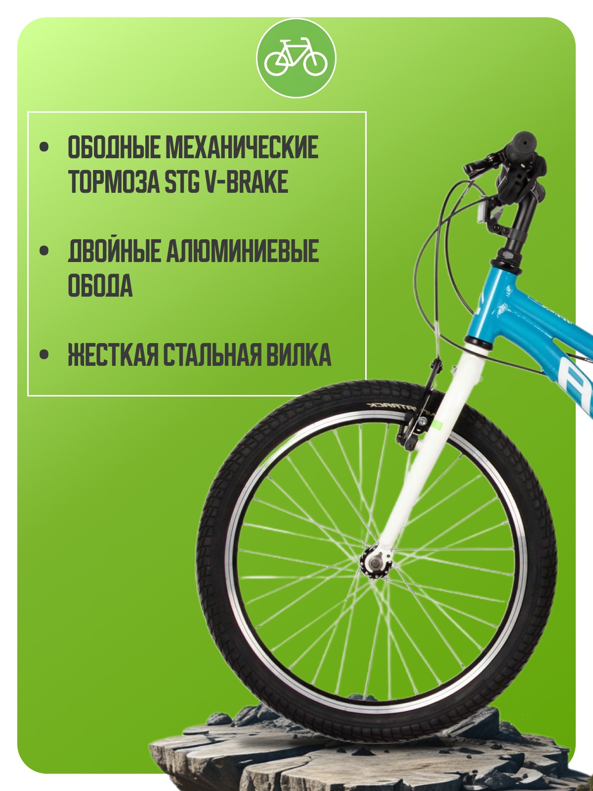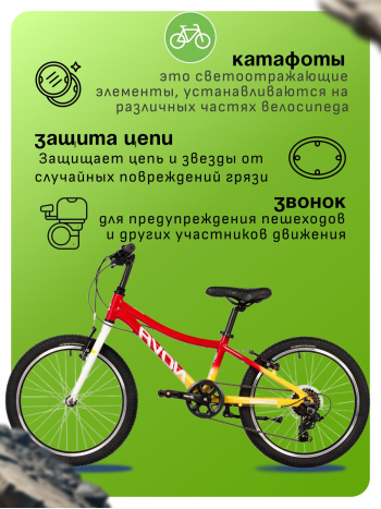 Велосипед, предназначенный для детей в возрасте от пяти до девяти лет, с оборудованием начального класса Shimano, 6 скоростей. Технические особенности: легкая алюминиевая рама (частично скрытая проводка), жесткая стальная вилка, двойные алюминиевые обода (под AV ниппель), ободные механические тормоза STG V-Brake, защита цепи, защита заднего переключателя, подножка, звонок, катафоты. Подходит для обучения и прогулочного катания в городских условиях. Диаметр колес - 20 дюймов. Вес - 12,5 кг.