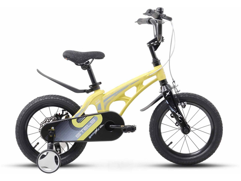 Велосипед, предназначенный для детей в возрасте от двух до четырех лет, без переключения передач. Технические особенности: легкая рама из магниевого сплава, жесткая вилка из магниевого сплава, одинарные стальные обода, передний тормоз - ободной, задний тормоз - дисковый механический (ротор 140 мм), защита цепи, съемные боковые колеса, пластиковые крылья, звонок. Подходит для обучения и прогулочного катания в городских условиях. Диаметр колес - 14 дюймов. Вес - 8,1 кг.