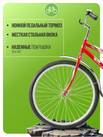 Женский дорожный велосипед без переключения передач. Технические особенности: прочная стальная рама (интегрированный подседельный хомут, кареточный стакан BSA), жесткая стальная вилка, двойные алюминиевые обода (под AV ниппель), ножной педальный тормоз, защита цепи, длинные крылья, багажник, комфортное седло с эластомерами, звонок, катафоты, подножка. Подходит для прогулочной езды по шоссе и ровным проселочным дорогам. Диаметр колес - 26 дюймов. Вес - 17 кг.