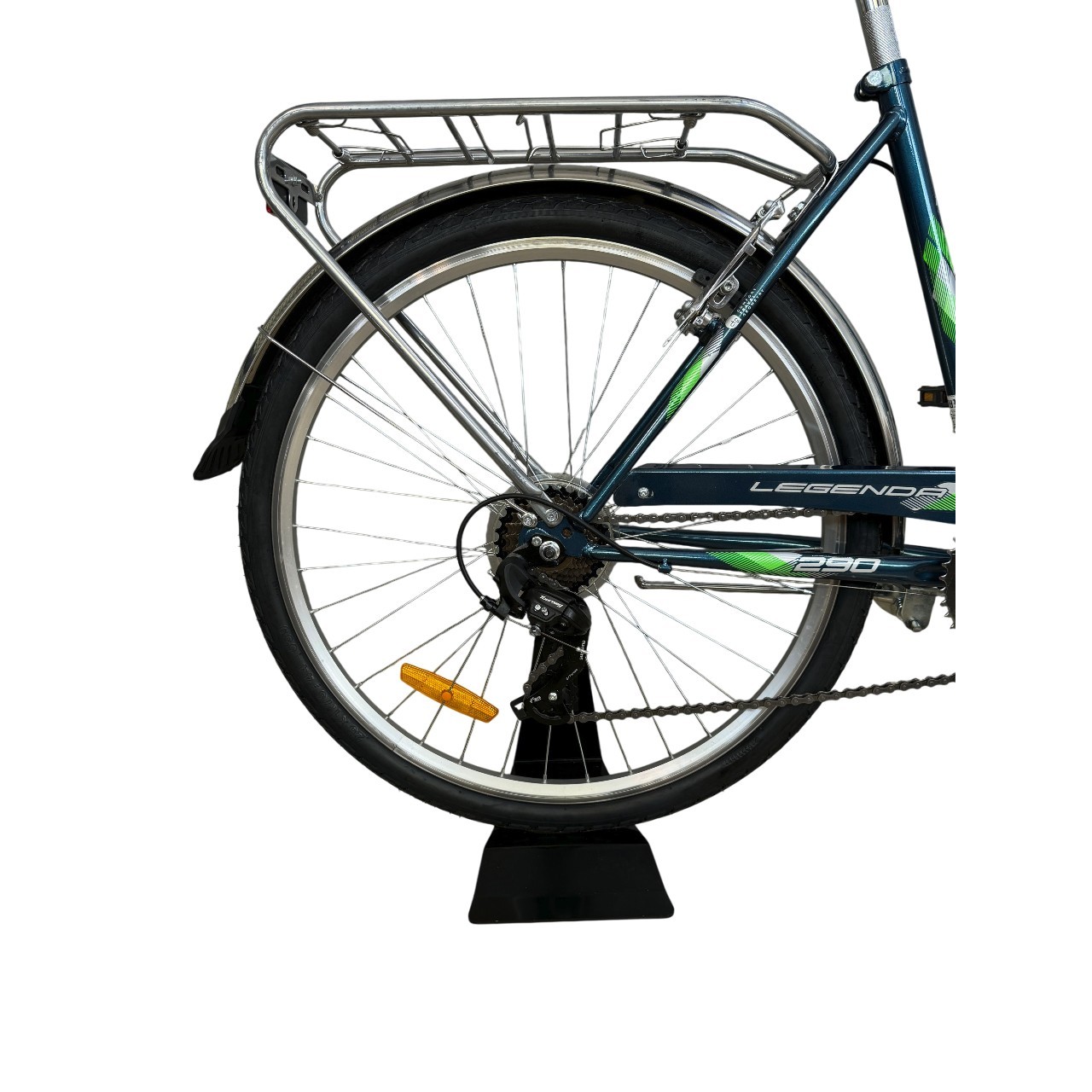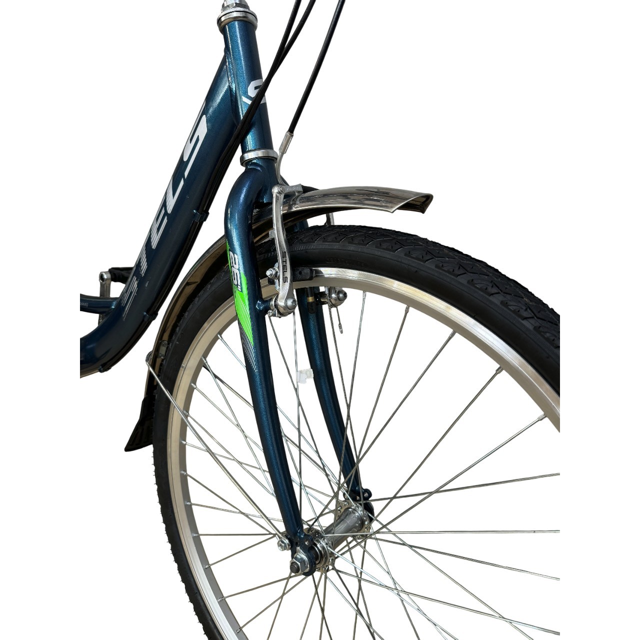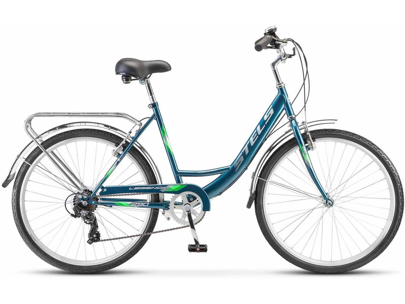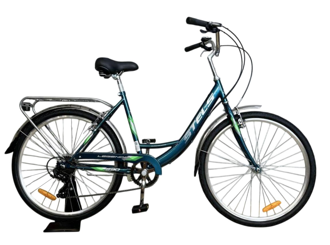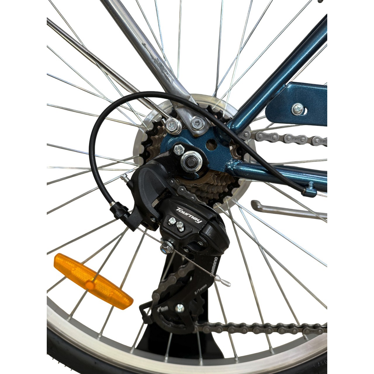 Женский дорожный велосипед с оборудованием начального класса Shimano, 7 скоростей. Технические особенности: прочная стальная рама (интегрированный подседельный хомут, кареточный стакан BSA, открытая прокладка тросов), жесткая стальная вилка, двойные алюминиевые обода (под AV ниппель), надежные ободные тормоза V-Brake (алюминиевые рычаги), защита цепи, длинные крылья, багажник, комфортное седло с эластомерами, звонок, катафоты, подножка. Подходит для прогулочной езды по шоссе и ровным проселочным дорогам. Диаметр колес - 26 дюймов. Вес - 16,2 кг.