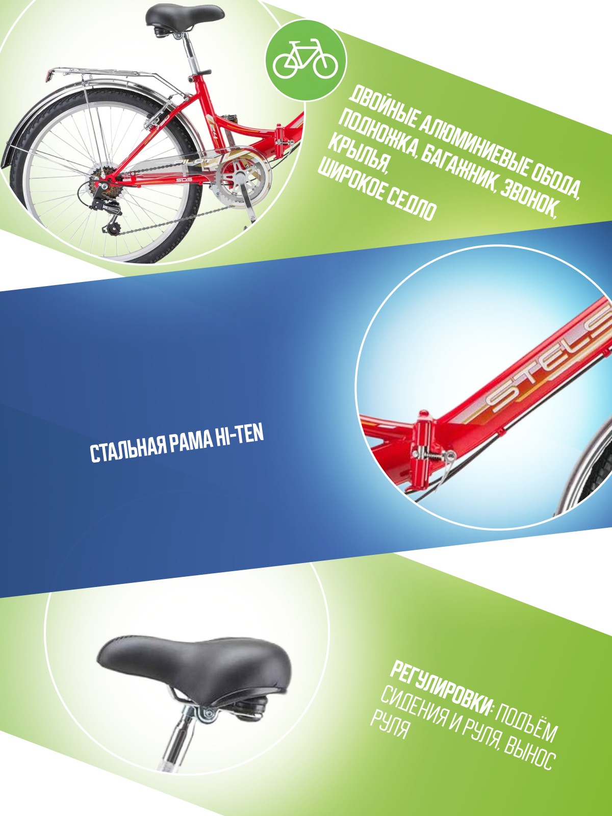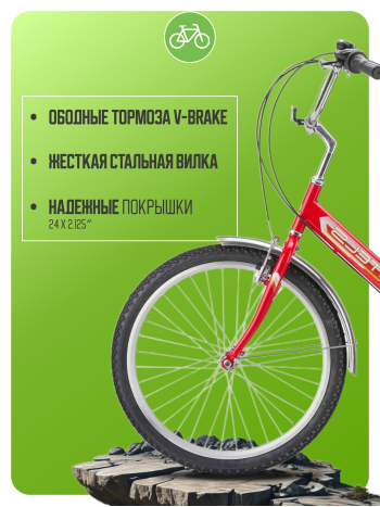 Складной прогулочный велосипед с оборудованием начального класса Shimano, 6 скоростей. Технические особенности: стальная рама Hi-Ten (замок складного механизма на эксцентрике, интегрированный подседельный хомут, кареточный стакан BSA, открытая прокладка тросов), жесткая стальная вилка, двойные алюминиевые обода (под AV ниппель), надежные ободные тормоза V-Brake (алюминиевые рычаги), багажник, защита цепи, звонок, длинные крылья из нержавеющей стали, катафоты. Подходит для прогулочного катания в городских условиях и по несложным маршрутам в лесу. Диаметр колес - 24 дюйма. Вес - 17,42 кг.