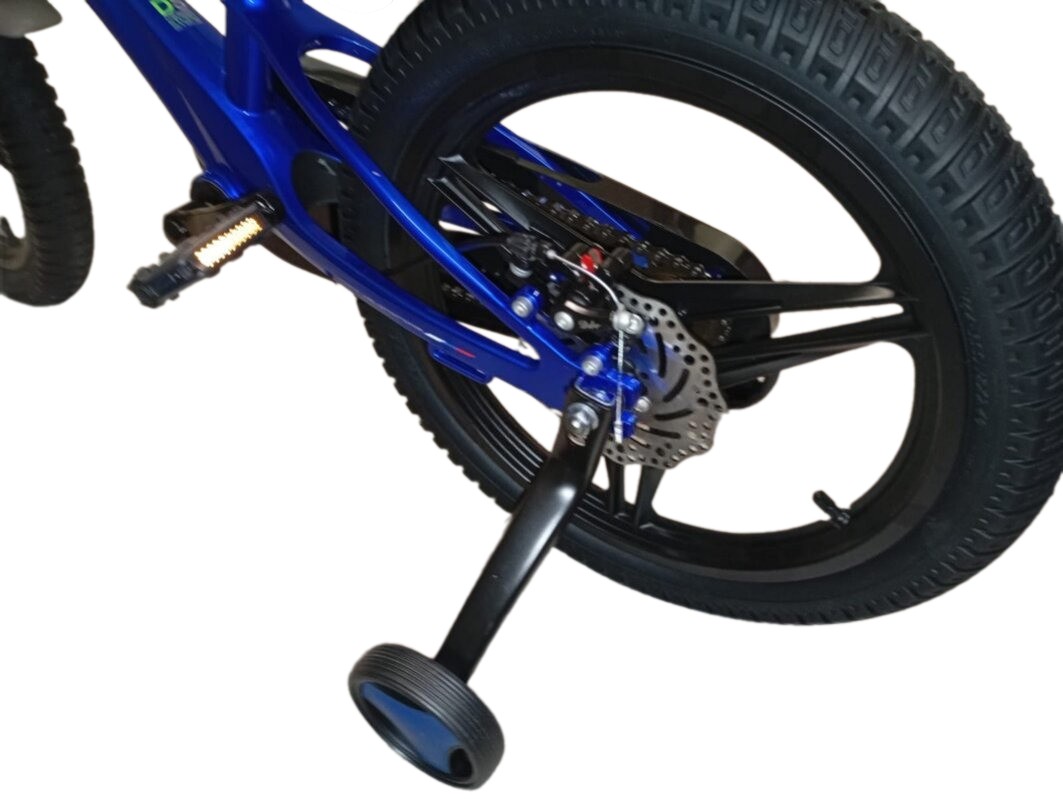 Велосипед, предназначенный для детей в возрасте от четырех до восьми лет, без переключения передач. Технические особенности: легкая рама из магниевого сплава, жесткая вилка из магниевого сплава, литые магниевые обода (под AV ниппель), дисковые механические тормоза (роторы 140/140 мм), защита цепи, съемные боковые колеса, пластиковые крылья, звонок, передняя корзинка. Подходит для обучения и прогулочного катания в городских условиях. Диаметр колес - 18 дюймов. Вес - 10,5 кг.