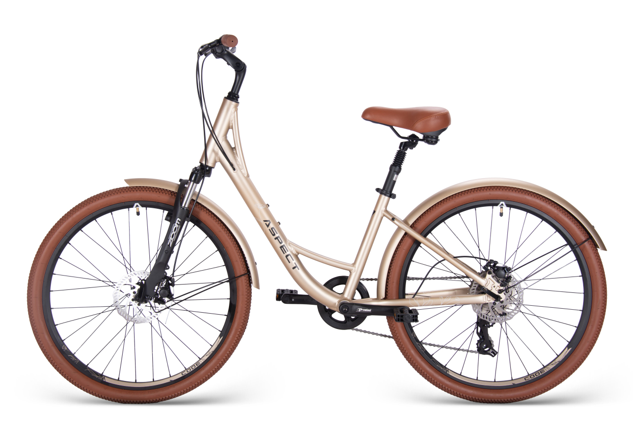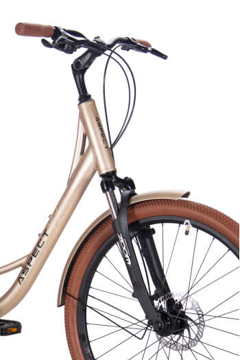 Женский комфортабельный велосипед с навесным оборудованием Shimano, 8 скоростей. Технические особенности: легкая алюминиевая рама (сплав 6061, скрытая прокладка тросов, гидроформинг, катерка BSA, рулевой стакан ZS, закладные под флягодержатель, съёмный петух), амортизационная вилка Zoom 141 (ход 45 мм, регулировка предварительной нагрузки пружины), двойные алюминиевые обода (под AV ниппель, 32Н), дисковые механические тормоза Radius BX-350 (роторы RT553 160/160 мм), защита цепи, длинные крылья, комфортное село, амортизированный подседельный штырь, регулируемый вынос. Подходит для прогулочного катания в городских условиях и по несложным маршрутам в лесу. Диаметр колес - 26 дюймов. Вес - 16 кг.