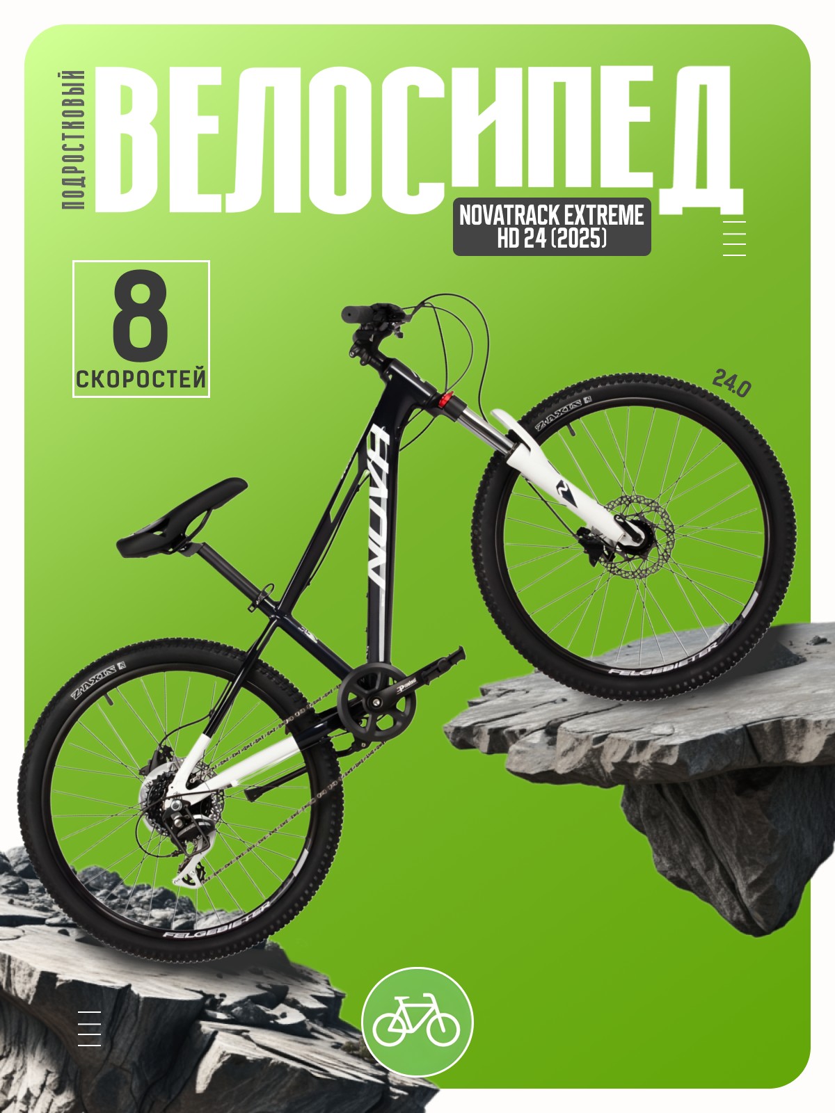 Велосипед, предназначенный для мальчиков в возрасте от восьми до тринадцати лет, с навесным оборудованием Shimano, 8 скоростей. Технические особенности: легкая алюминиевая рама (сплав 6061, сглаженные швы, полуинтегрированная рулевая колонка, кареточный стакан BSA, частично скрытая прокладка тросов, крепление тормозного калипера IS, съёмный петух), амортизационная вилка Novatrack (пружинно-масляная, рабочий ход 90 мм, блокировка, регулировка предварительной нагрузки), двойные алюминиевые обода (под ниппель A/V), дисковые гидравлические тормоза Shimano MT200 (роторы 160/140 мм), защита цепи, защита заднего переключателя, подножка, звонок, катафоты. Подходит для прогулочного катания в городских условиях и по несложным маршрутам в лесу. Диаметр колес - 24 дюйма. Вес - 13,5 кг.