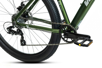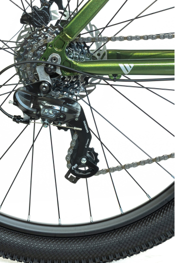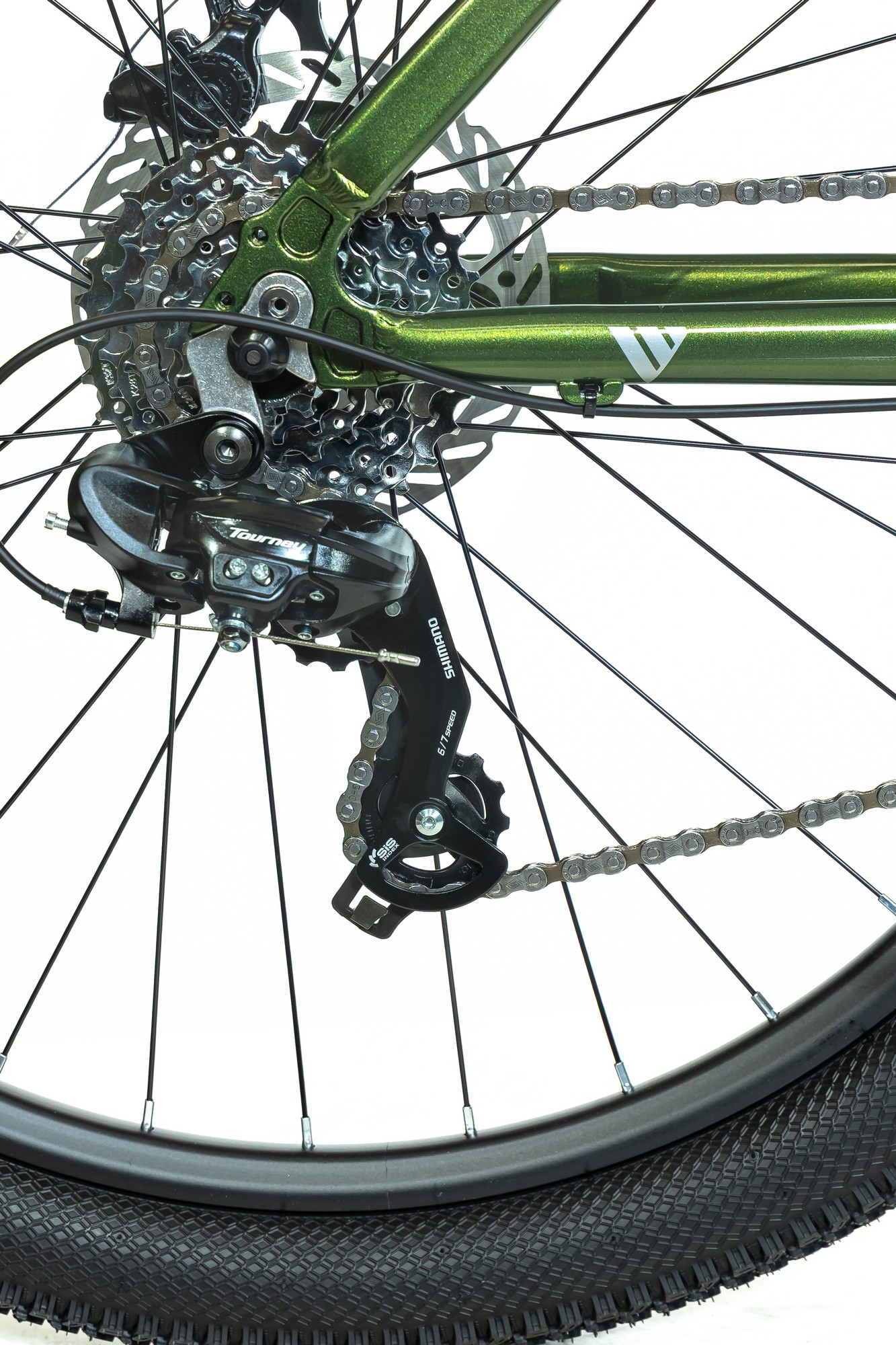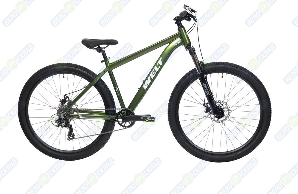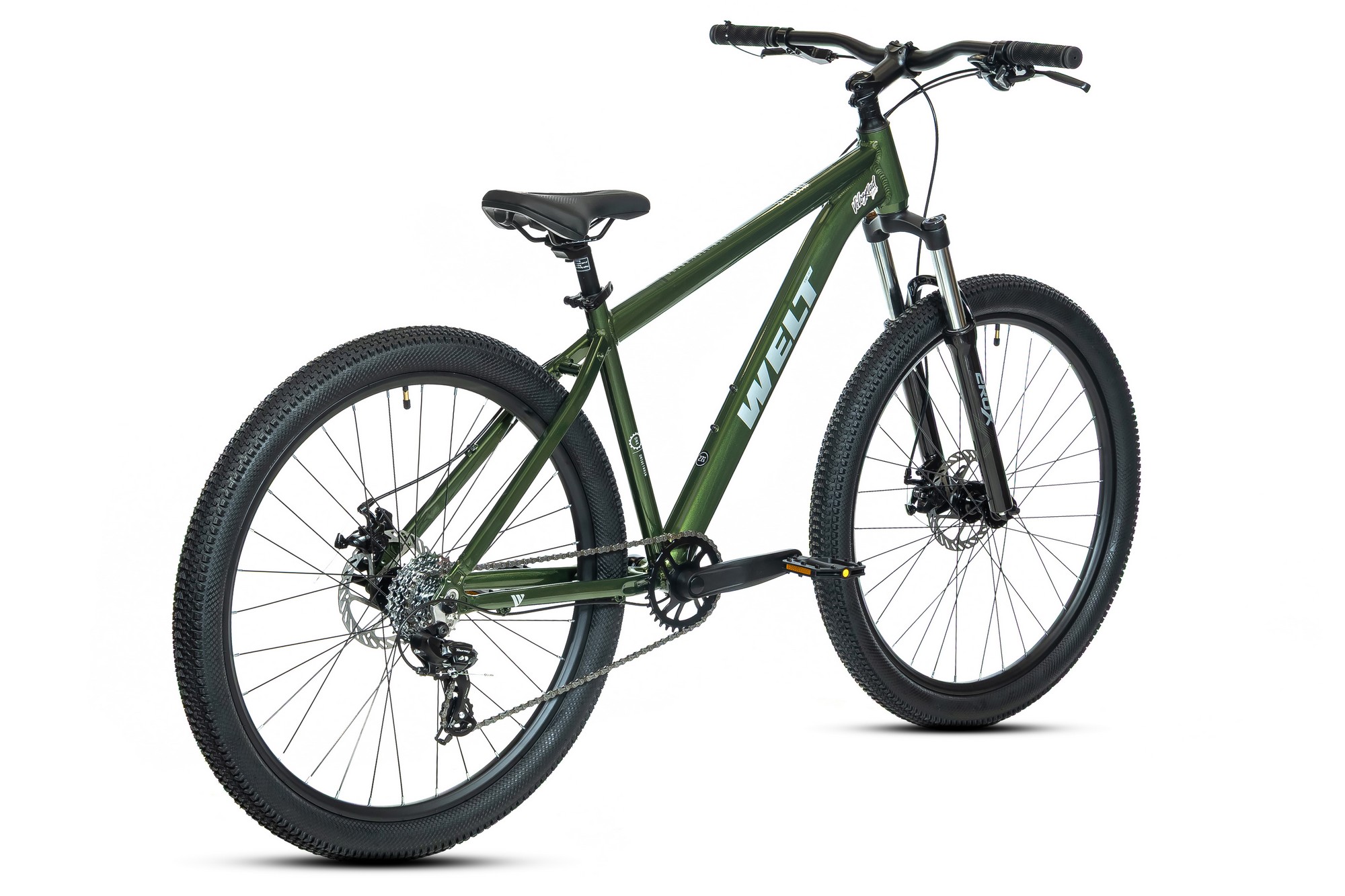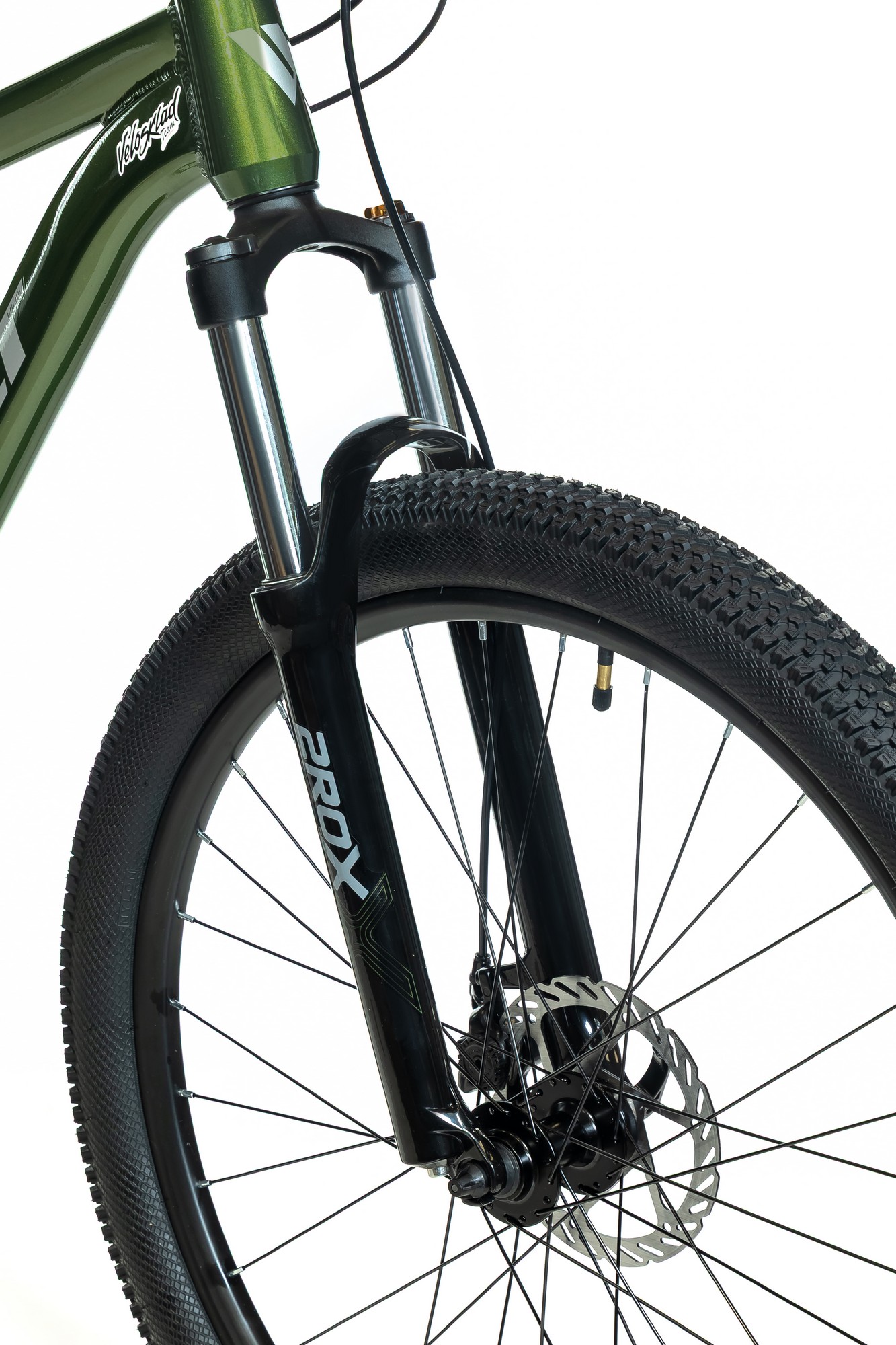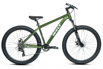 Горный велосипед с оборудованием начального класса Shimano, 7 скоростей. Технические особенности: легкая алюминиевая рама (сплав 6061, внутренняя прокладка тросов, съёмный петух, рулевой стакан ZS, крепление калипера PM, каретка BSA), амортизационная вилка 2ROXX 981 (пружинно-эластомерная, ход 100 мм, алюминиевые штаны, блокировка хода), двойные алюминиевые обода (под AV ниппель), дисковые механические тормоза DX2005 (роторы 160/160 мм). Подходит для активной езды по различным дорогам и пересеченной местности. Диаметр колес - 27,5 дюймов. Вес - 14,6 кг.