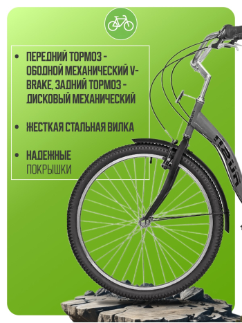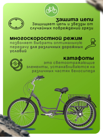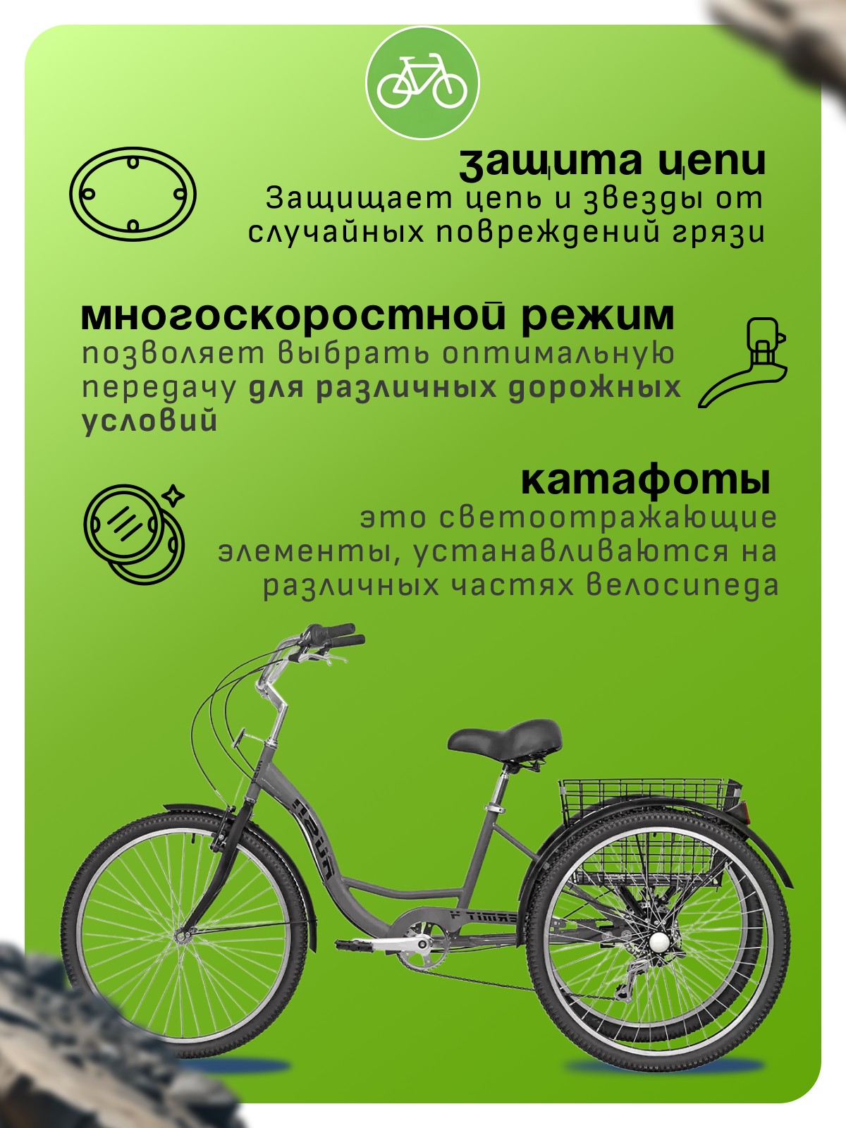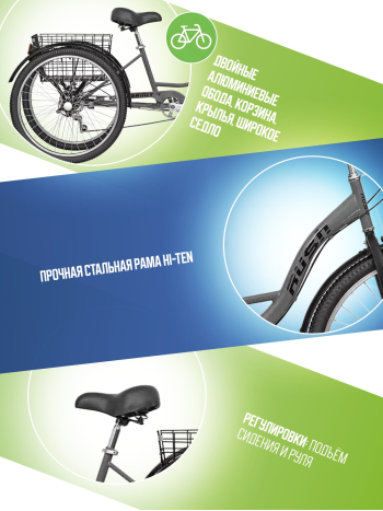 Грузовой трехколесный велосипед с оборудованием начального класса Shimano, 6 скоростей. Технические особенности: прочная стальная рама Hi-Ten (заниженная геометрия), жесткая стальная вилка (резьбовой шток 25.4 мм), двойные алюминиевые обода (под AV ниппель), передний тормоз - ободной механический V-brake, задний тормоз - дисковый механический, защита цепи, длинные крылья, комфортное седло с пружинами, задняя корзина, катафоты. Подходит для прогулочной езды по шоссе и ровным проселочным дорогам, а также для перевозки различных грузов. Диаметр колес - 26 дюймов. Вес - 24,6 кг.