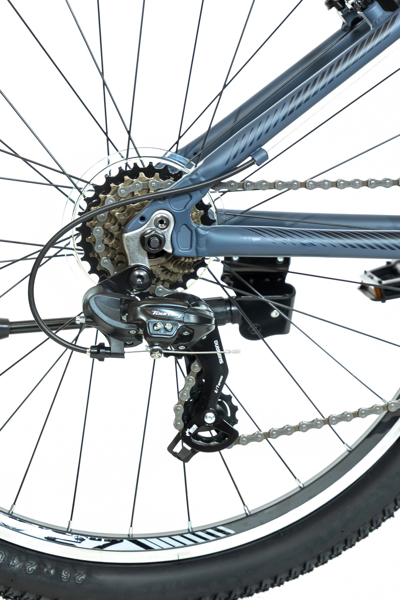 Переключает (перебрасывает) цепь на задних звездах. Принцип действия у всех одинаков — приводится в движение тросиком. Отличаются классом и производителем. Если рассматривать их взаимозаменяемость, то нужно учитывать следующие: параметры и диаметр крепежного хомута, его расположение (верхний или нижний), как подведен тросик (сверху или снизу переключателя, так называемая, тяга переключателя), а также количество зубьев на звездах. Регулировка заднего переключателя производится по тому же принципу что и регулировка переднего, однако здесь есть свои особенности. Так как данный тип оборудования достаточно обособлен от общей конструкции, некоторые велосипедисты устанавливают на ось специальную защитную скобу.