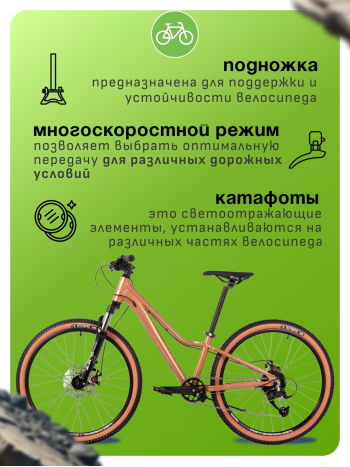 Велосипед, предназначенный для девочек в возрасте от восьми до тринадцати лет, с навесным оборудованием Microshift, 8 скоростей. Подходит для прогулочной езды по различным дорогам и пересеченной местности. Диаметр колес - 24 дюйма. Вес - 14,7 кг.
