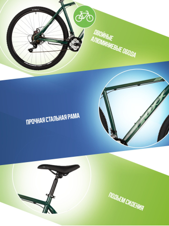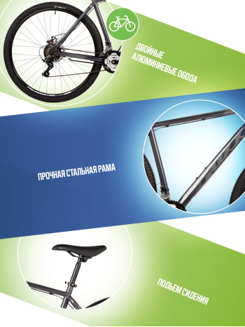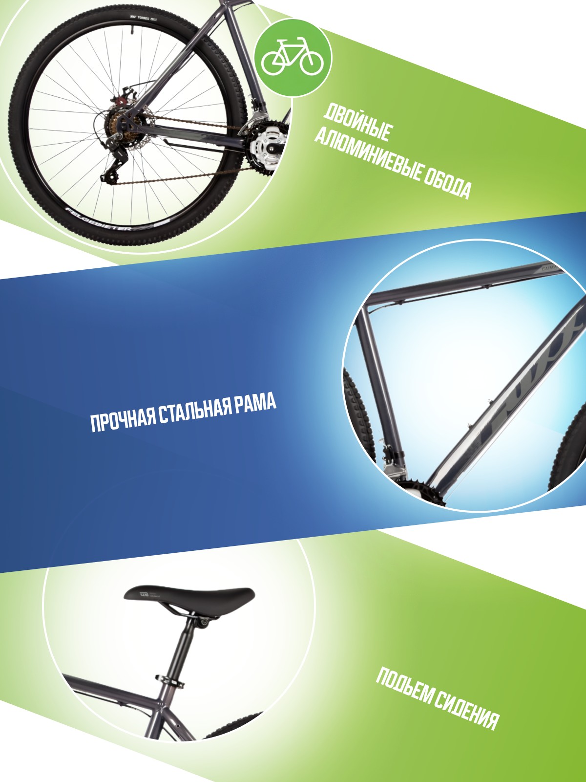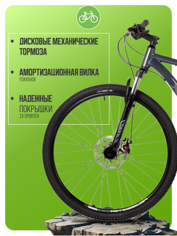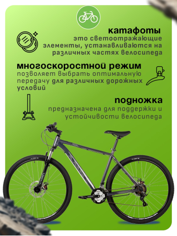 Горный велосипед для начинающих с навесным оборудованием Shimano, 21 скорость. Технические особенности: прочная стальная рама (крепление калипера IS, интегрированный петух), амортизационная вилка Foxxshox (пружинная, ход 50 мм, алюминиевая корона), двойные алюминиевые обода (под AV ниппель), дисковые механические тормоза (роторы 180/160 мм, крепление на 6 болтов), подножка, катафоты. Подходит для прогулочной езды по различным дорогам и пересеченной местности. Диаметр колес - 29 дюйма. Вес - 18 кг.