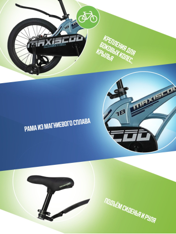 Велосипед, предназначенный для детей в возрасте от четырех до восьми лет, без переключения передач. Технические особенности: легкая рама из магниевого сплава (частично скрытая прокладка тросов, крепление тормозного калипера IS), жесткая вилка из магниевого сплава, одинарные алюминиевые обода (под AV ниппель), передний тормоз - ободной клещевой, задний тормоз - дисковый механический, полная защита цепи, съемные боковые колеса, пластиковые крылья, звонок. Подходит для обучения и прогулочного катания в городских условиях. Диаметр колес - 18 дюймов. Вес - 10 кг.
