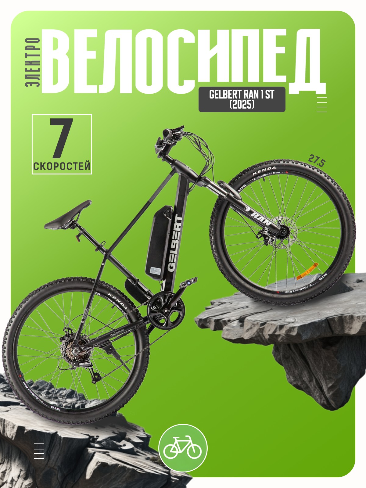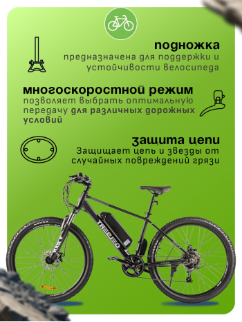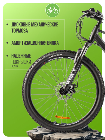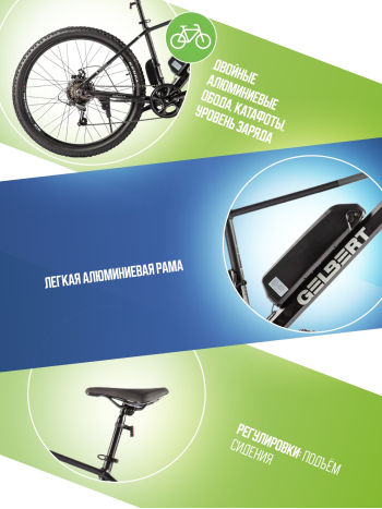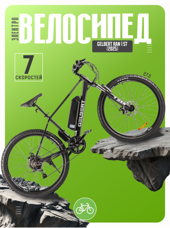 Спортивный электровелосипед с оборудованием начального класса Shimano, 7 скоростей. Подходит для активной езды по различным дорогам и пересеченной местности. Максимальная скорость: до 25 км/ч. Пробег на одной зарядке: до 30 кг. Грузоподъемность: до 110 кг. Диаметр колес - 27,5 дюймов. Вес - 21,5 кг.