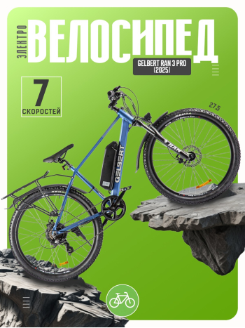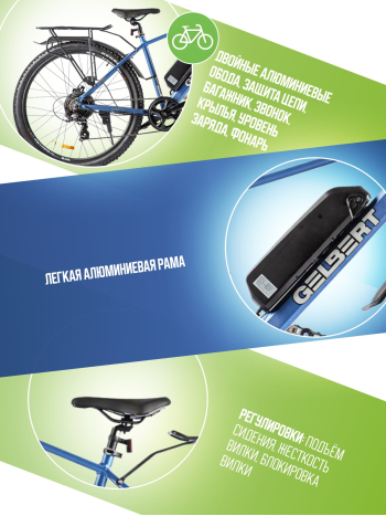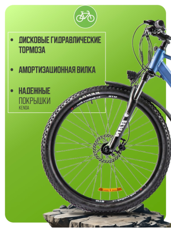Спортивный электровелосипед с оборудованием начального класса Shimano, 7 скоростей. Подходит для активной езды по различным дорогам и пересеченной местности. Максимальная скорость: до 35 км/ч. Пробег на одной зарядке: до 50 кг. Грузоподъемность: до 110 кг. Диаметр колес - 27,5 дюймов. Вес - 23,5 кг.