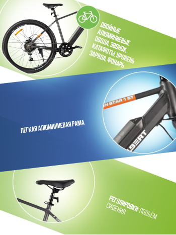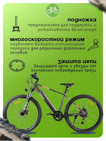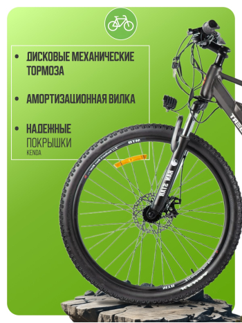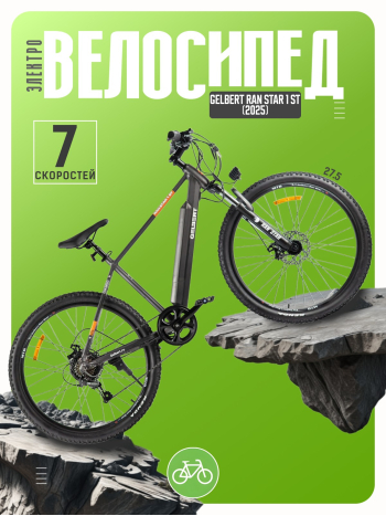 Спортивный электровелосипед с оборудованием начального класса Shimano, 7 скоростей. Подходит для активной езды по различным дорогам и пересеченной местности. Максимальная скорость: до 25 км/ч. Пробег на одной зарядке: до 30 кг. Грузоподъемность: до 110 кг. Диаметр колес - 27,5 дюймов. Вес - 22 кг.