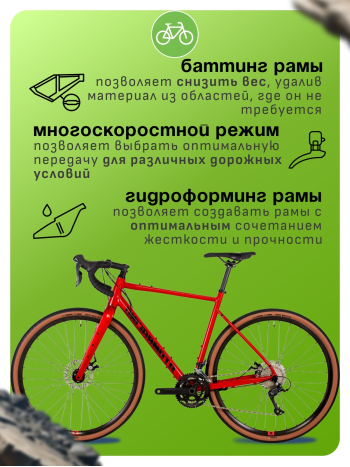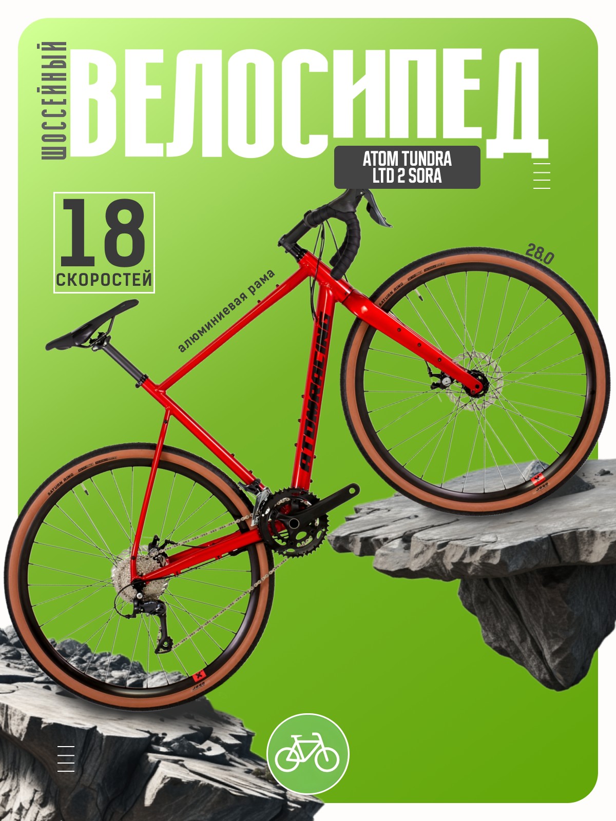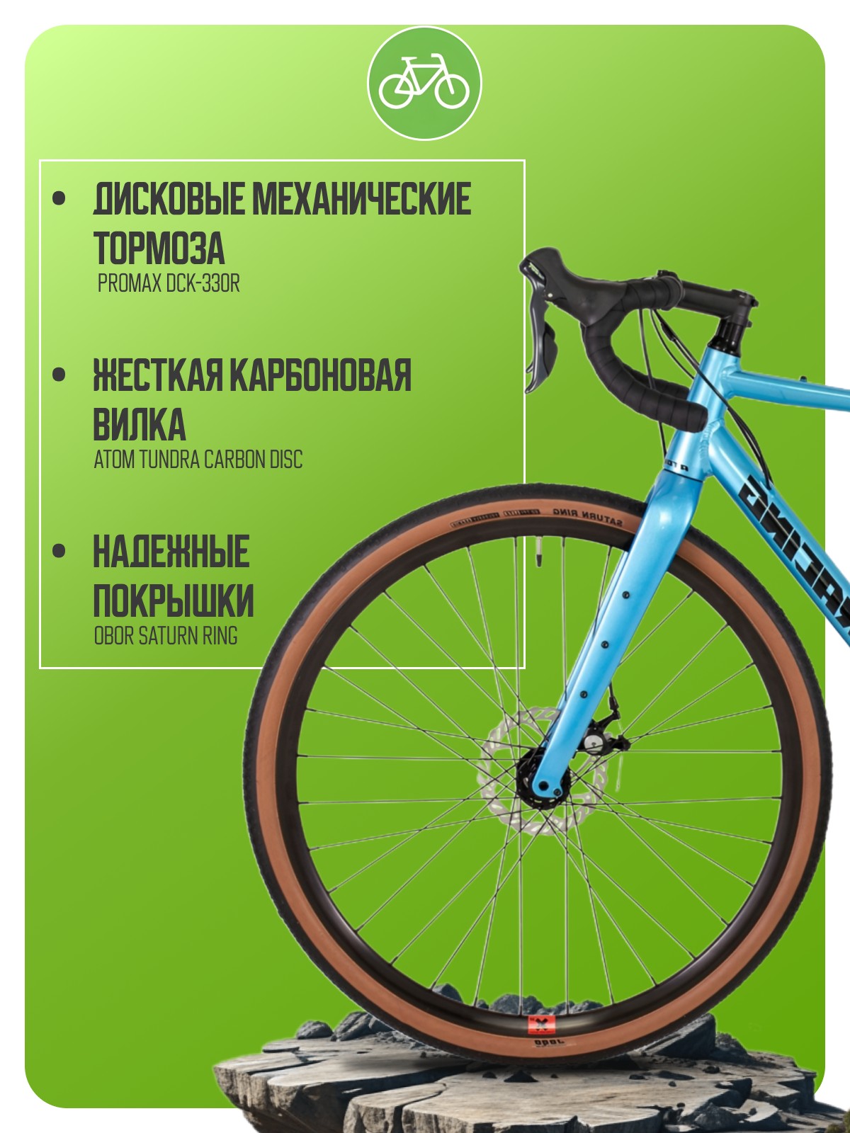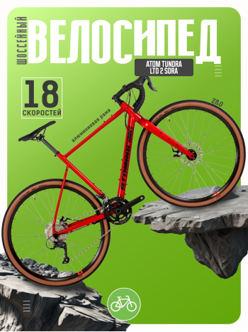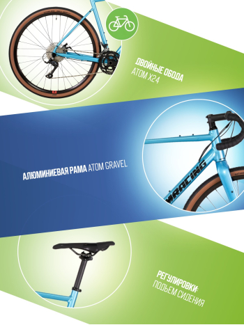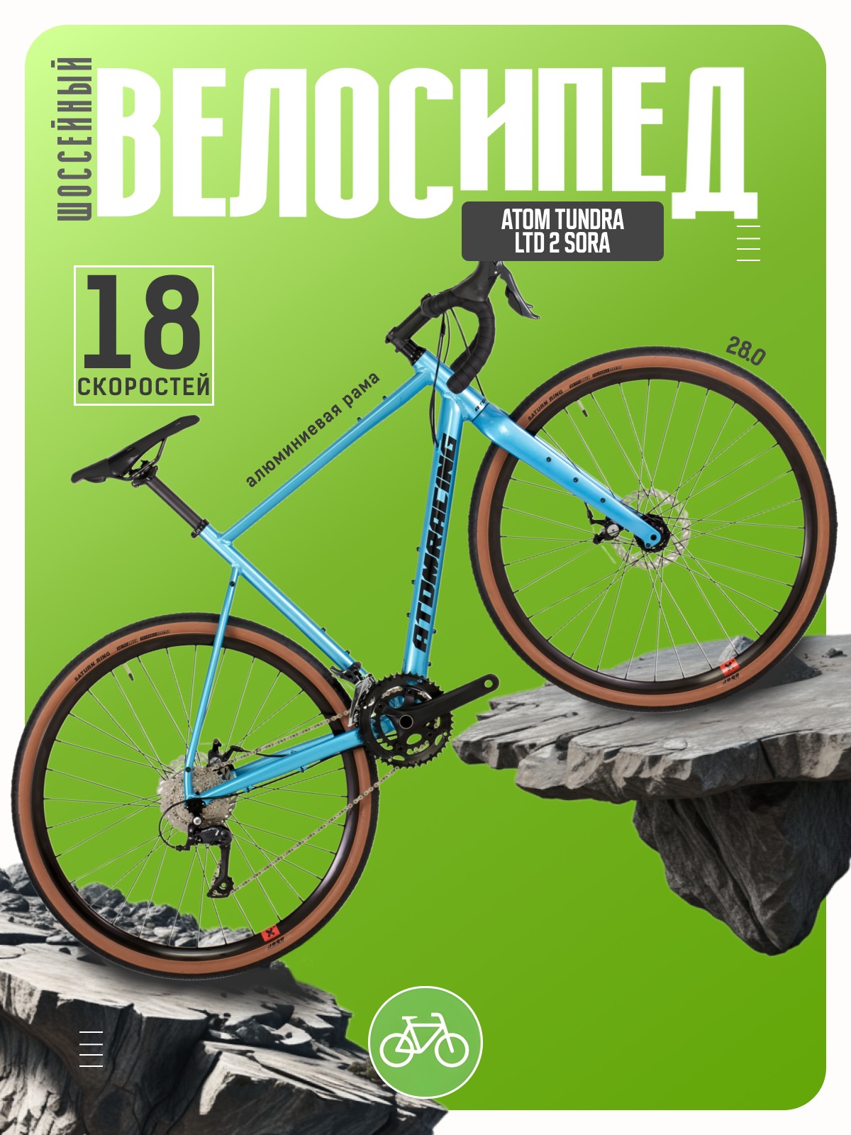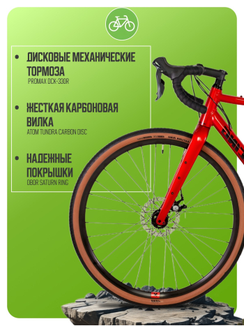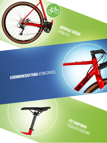 - алюминиевая рама ATOM Gravel (сплав AL6069, конический рулевой стакан, тройной баттинг, внутренняя проводка, дропауты под полую ось),