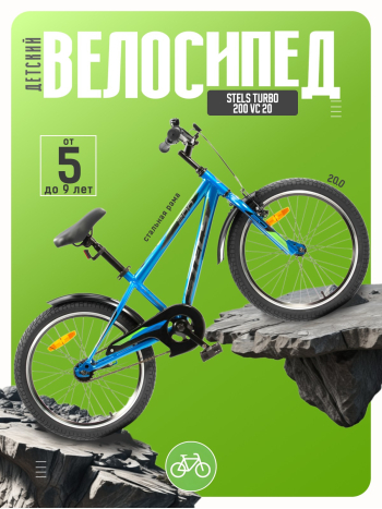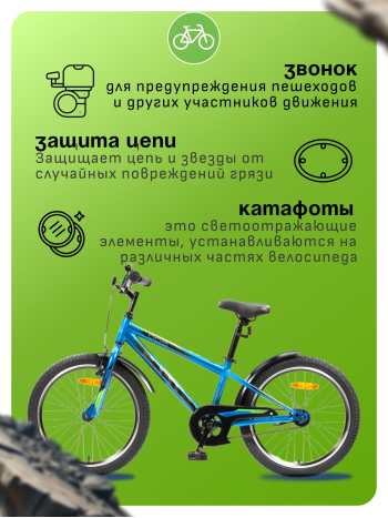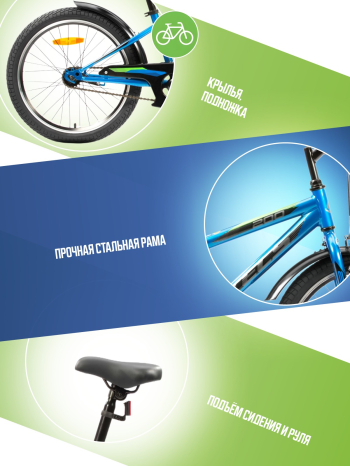Велосипед, предназначенный для детей в возрасте от пяти до девяти лет, с навесным оборудованием начального класса, без переключения передач. Технические особенности: прочная стальная рама, жесткая стальная вилка, одинарные алюминиевые обода, передний тормоз ободной, а задний ножной, защита цепи, крылья, катафоты, звонок. Подходит для прогулочного катания в городских условиях и по несложным маршрутам в лесу. Диаметр колес - 20 дюйма. Вес - 12,09 кг.