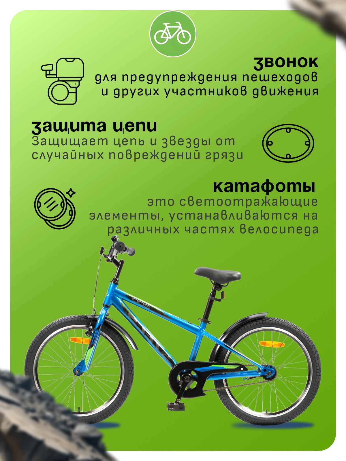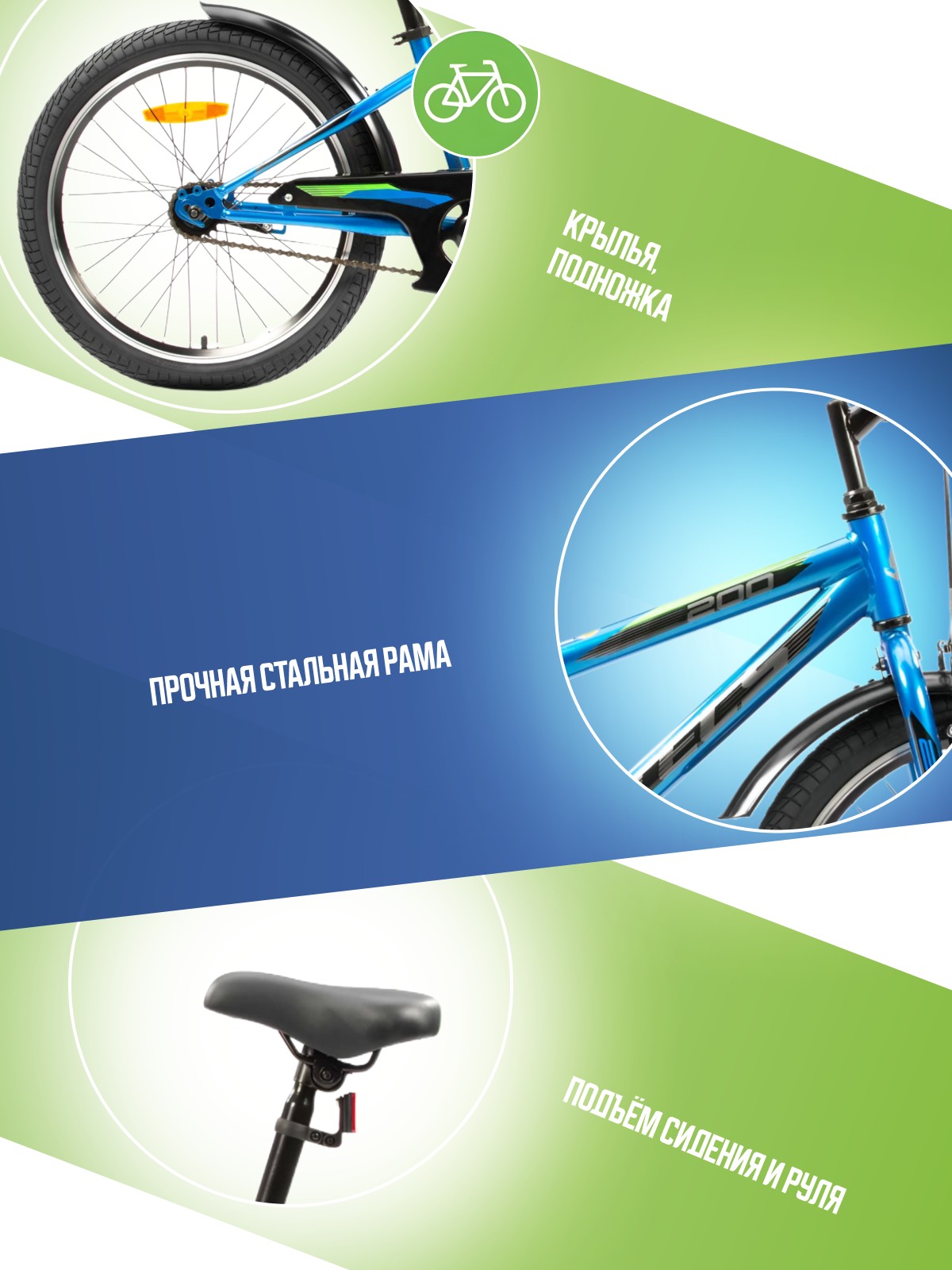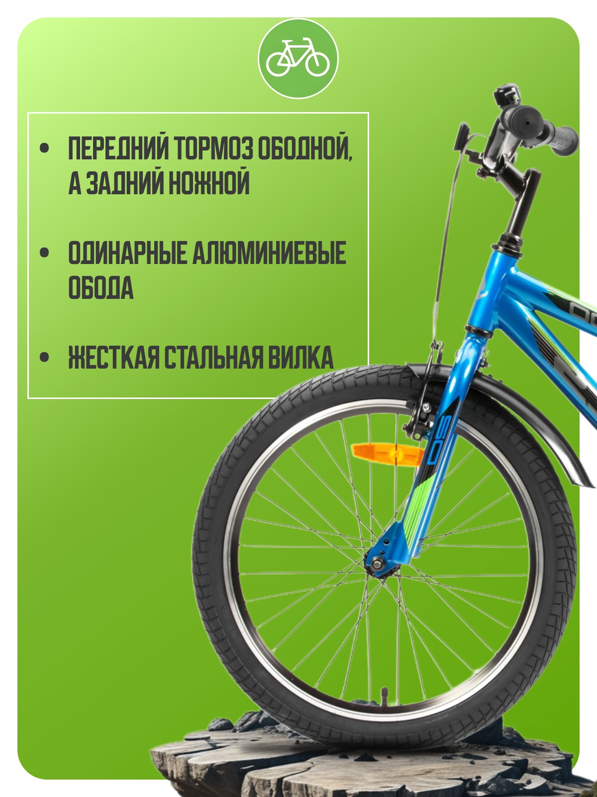 Велосипед, предназначенный для детей в возрасте от пяти до девяти лет, с навесным оборудованием начального класса, без переключения передач. Технические особенности: прочная стальная рама, жесткая стальная вилка, одинарные алюминиевые обода, передний тормоз ободной, а задний ножной, защита цепи, крылья, катафоты, звонок. Подходит для прогулочного катания в городских условиях и по несложным маршрутам в лесу. Диаметр колес - 20 дюйма. Вес - 12,09 кг.