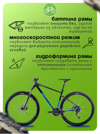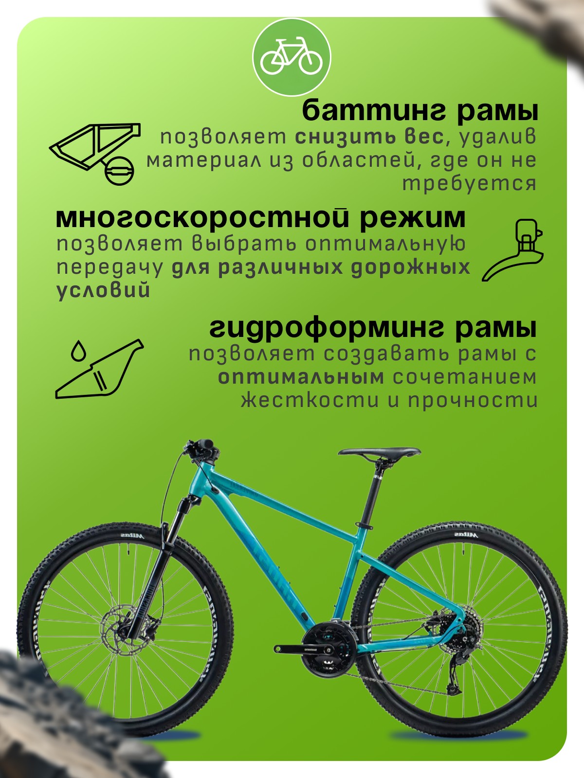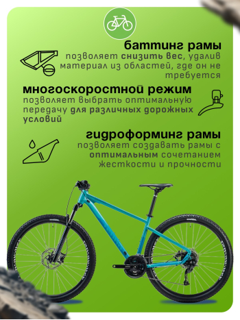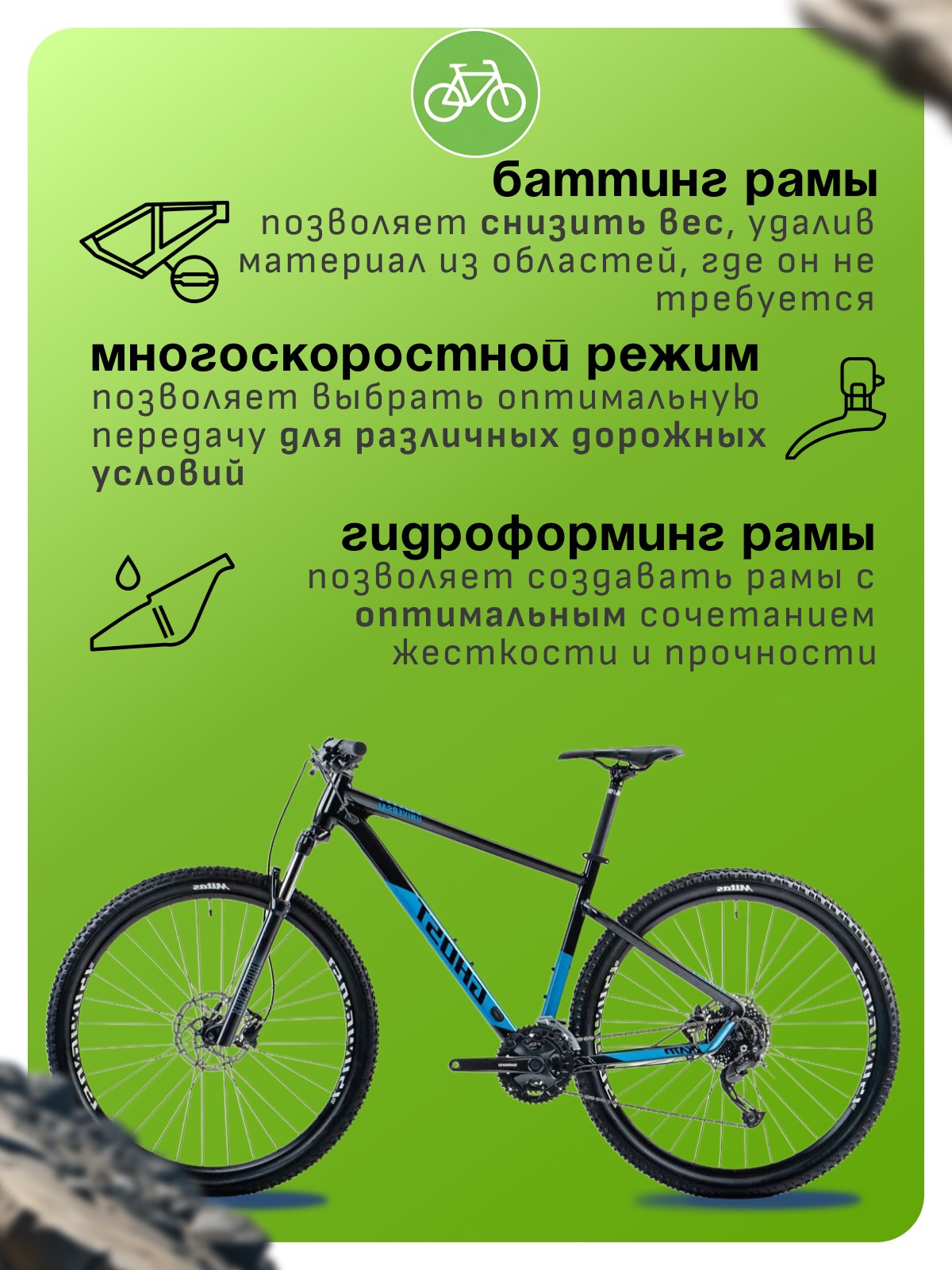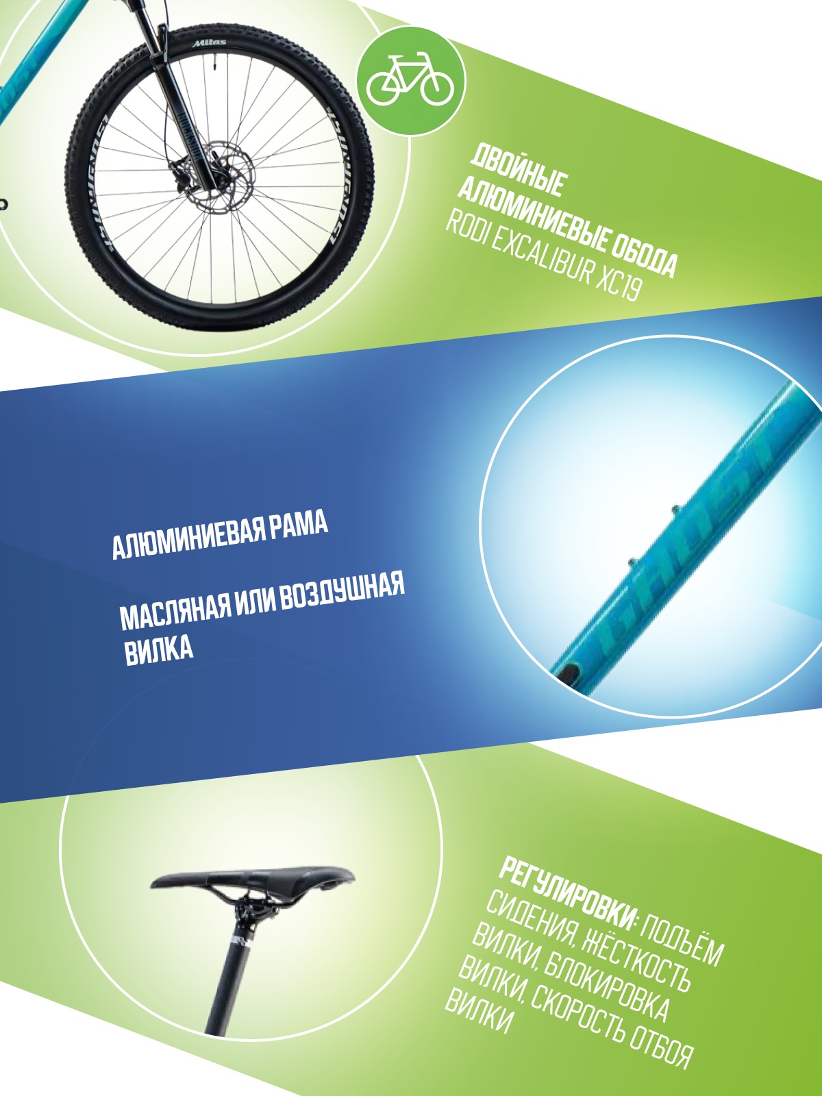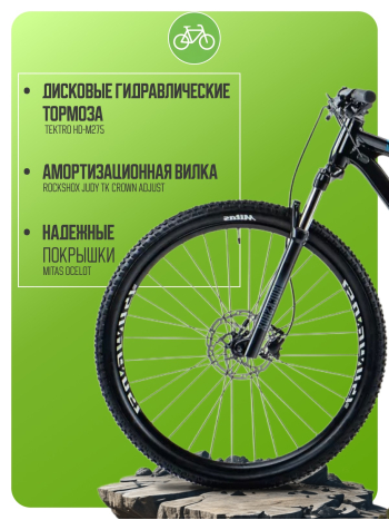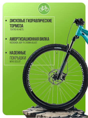 Горный велосипед с оборудованием высшего любительского класса Shimano, 27 скоростей. Технические особенности: алюминиевая рама (сплав 6061, скрытая проводка, гидроформинг, баттинг, кареточный стакан BSA, съемный петух), амортизационная вилка Rockshox Judy TK Crown Adjust (масляно-пружинная, ход 100 мм, блокировка, отскок), двойные алюминиевые обода Rodi Excalibur XC19 (под ниппель Presta), дисковые гидравлические тормоза Tektro HD-M275 (роторы 180/180 мм). Подходит для активной езды по различным дорогам и пересеченной местности. Диаметр колес - 29 дюймов. Вес - 14,9 кг.
