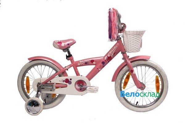 Велосипед, предназначенный для девочек в возрасте от двух до четырех лет, без переключения передач. Технические особенности: прочная стальная рама, жесткая стальная вилка, одинарные стальные обода (под AV ниппель), передний тормоз - ободной клещевой, задний тормоз - ножной педальный, полная защита цепи, полноразмерные крылья, съемные боковые колеса, передняя корзина, сиденье для куклы, звонок. Подходит для обучения и прогулочного катания в городских условиях. Диаметр колес - 14 дюймов. Вес - 9,4 кг.