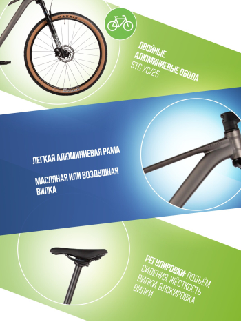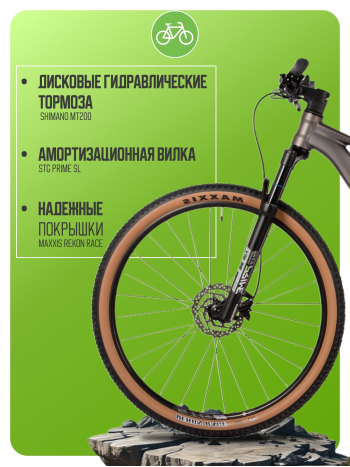 Хардтейл для езды в стиле кросс-кантри с оборудованием любительского класса Shimano, 8 скоростей. Технические особенности: легкая алюминиевая рама (сплав 6061-T6, баттинг, гидроформинг, сглаженные швы, скрытая проводка, дропауты под полую ось, крепление калипера Flat Mount), амортизационная вилка STG Prime SL (воздушно-масляная, ход 120 мм, крепление калипера Post Mount, блокировка), двойные алюминиевые обода STG XC/25 (под ниппель Presta), дисковые гидравлические тормоза Shimano MT200 (роторы Shimano 160/160 мм, 6-болтов). Подходит для активной езды по различным дорогам и пересеченной местности. Диаметр колес - 29 дюймов. Вес - 13,9 кг.