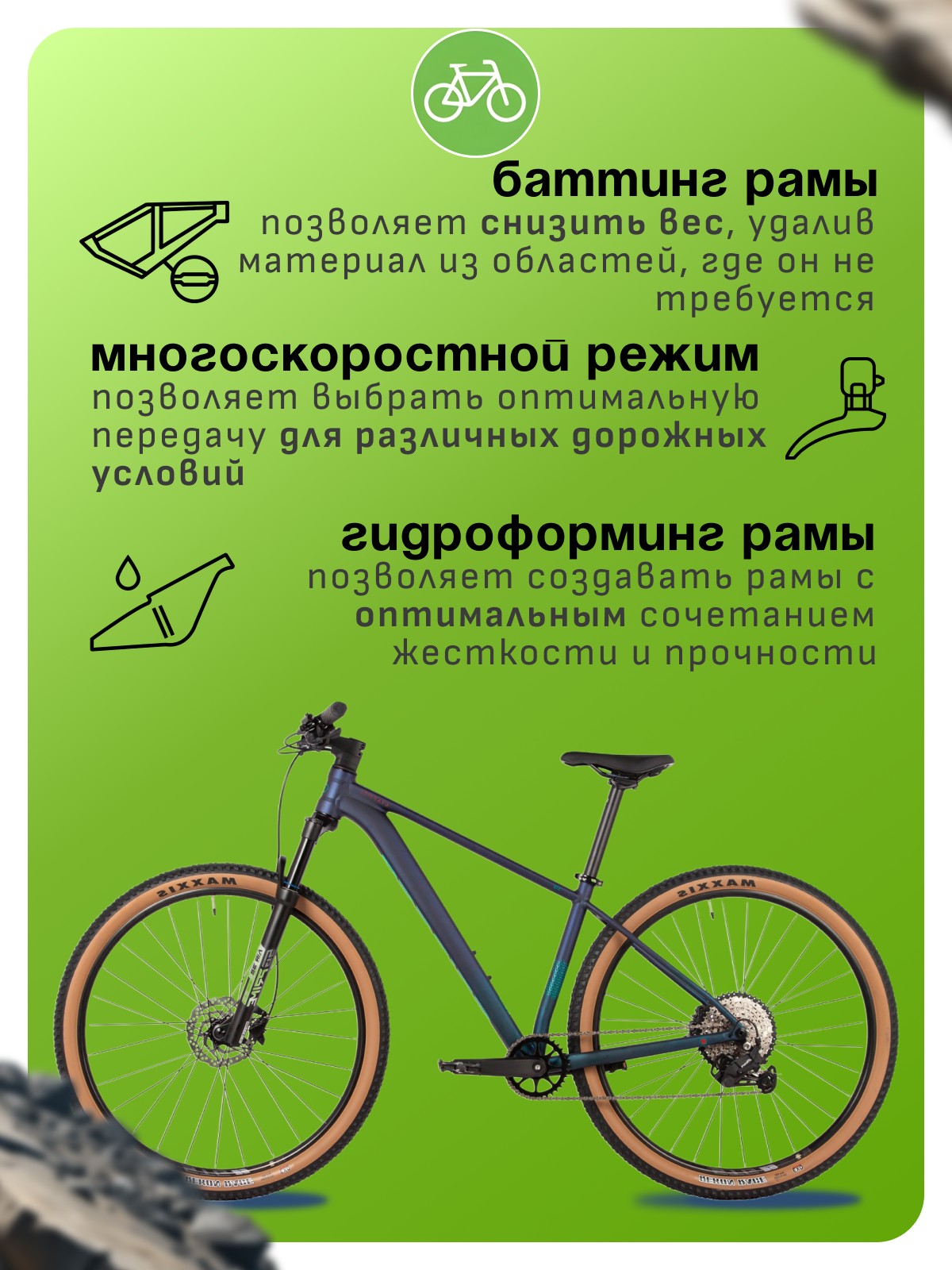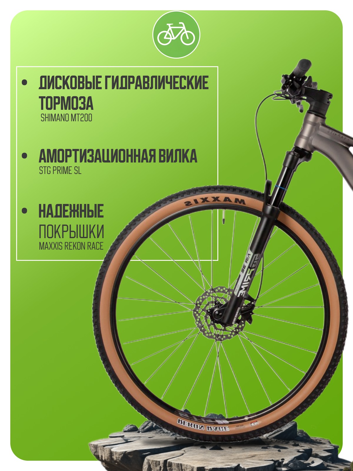 Хардтейл для езды в стиле кросс-кантри с оборудованием любительского класса Shimano, 8 скоростей. Технические особенности: легкая алюминиевая рама (сплав 6061-T6, баттинг, гидроформинг, сглаженные швы, скрытая проводка, дропауты под полую ось, крепление калипера Flat Mount), амортизационная вилка STG Prime SL (воздушно-масляная, ход 120 мм, крепление калипера Post Mount, блокировка), двойные алюминиевые обода STG XC/25 (под ниппель Presta), дисковые гидравлические тормоза Shimano MT200 (роторы Shimano 160/160 мм, 6-болтов). Подходит для активной езды по различным дорогам и пересеченной местности. Диаметр колес - 29 дюймов. Вес - 13,9 кг.