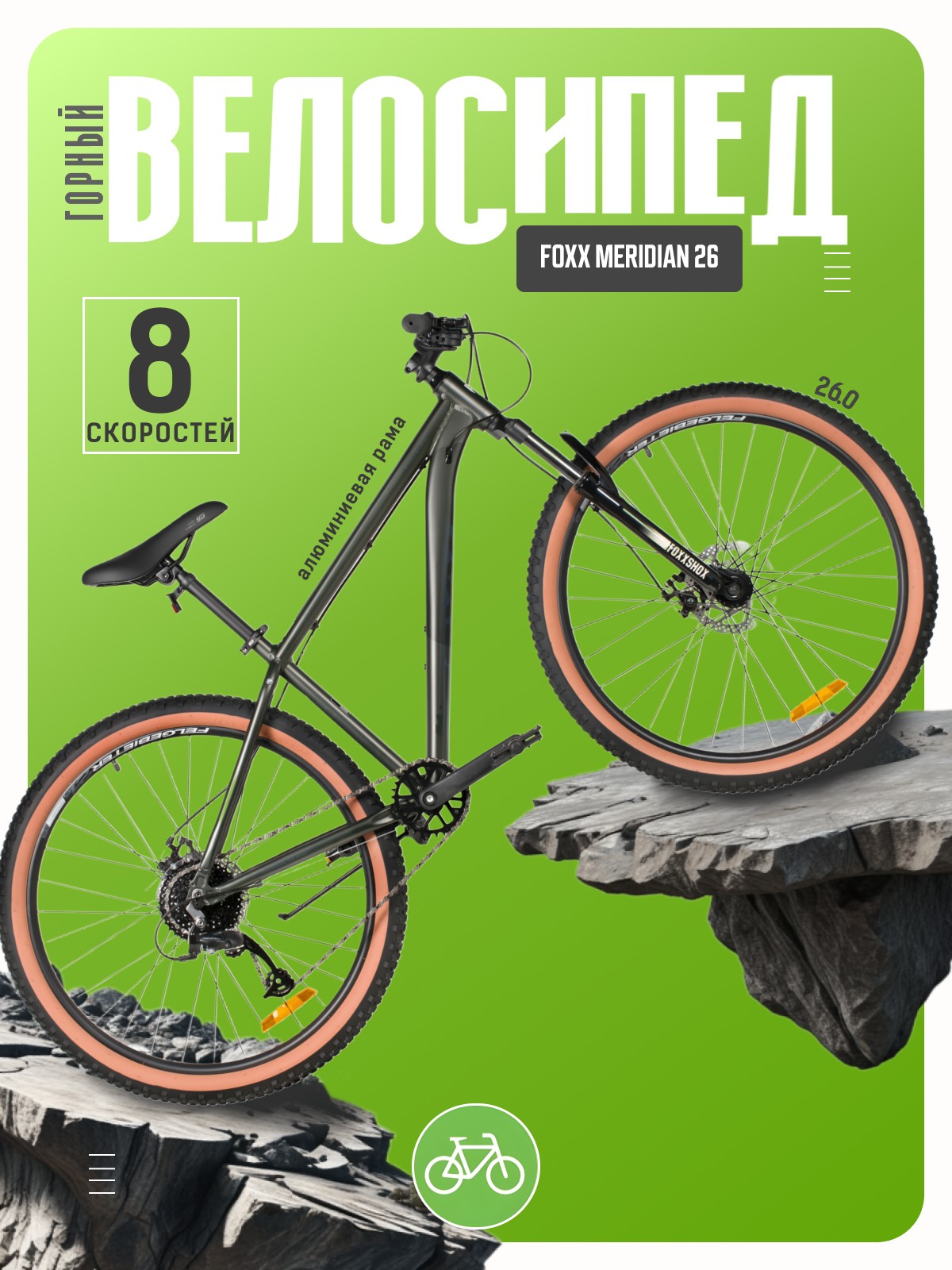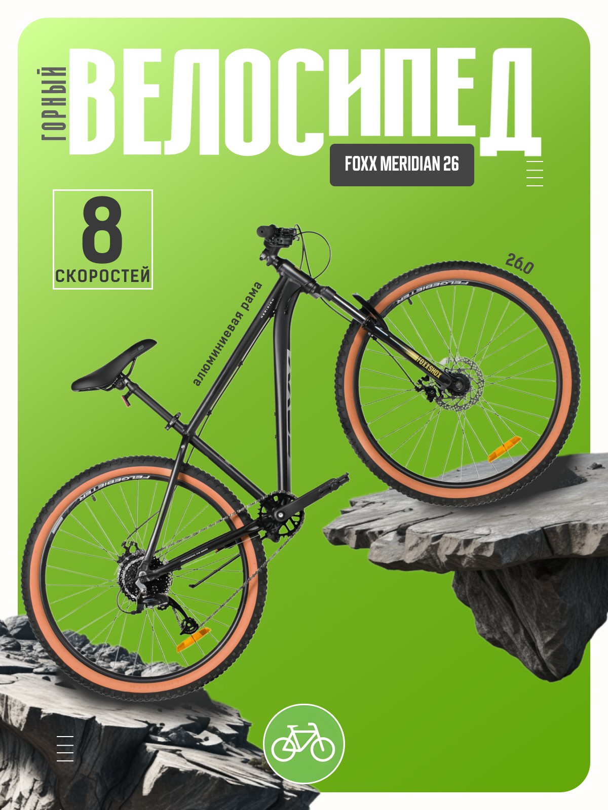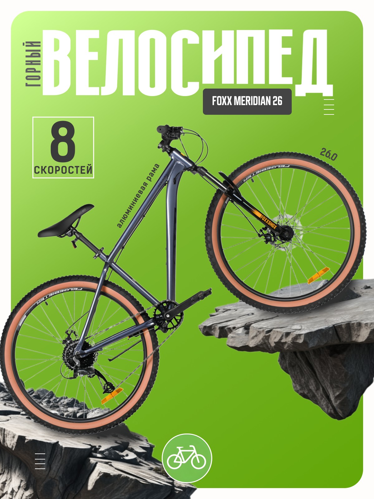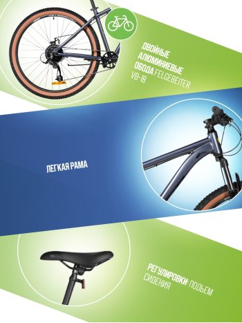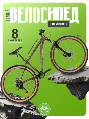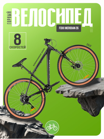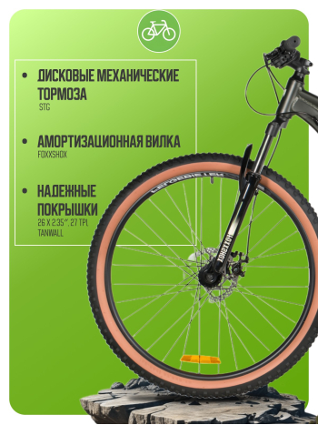 Горный велосипед для начинающих с навесным оборудованием Microshift, 8 скоростей. Технические особенности: легкая алюминиевая рама (сплав 6061-T6, частично скрытая проводка, кареточный стакан BSA, крепление калипера IS, прямой рулевой стакан, съемный петух, бонки для багажника и флягодержателя), амортизационная вилка Foxxshox (пружинная, ход 50 мм, диаметр ног 28.6 мм, стальная с алюминиевой короной), двойные алюминиевые обода Felgebeiter VB-18 (под AV ниппель), дисковые механические тормоза STG (роторы 160/140 мм, крепление на 6 болтов), подножка. Подходит для прогулочной езды по различным дорогам и пересеченной местности. Диаметр колес - 26 дюймов. Вес - 14,8 кг.