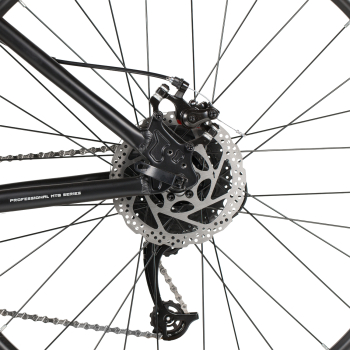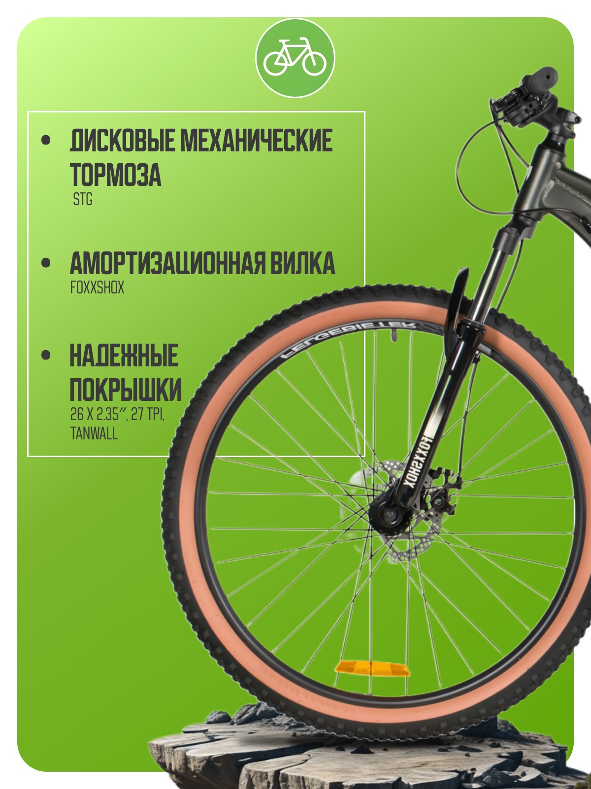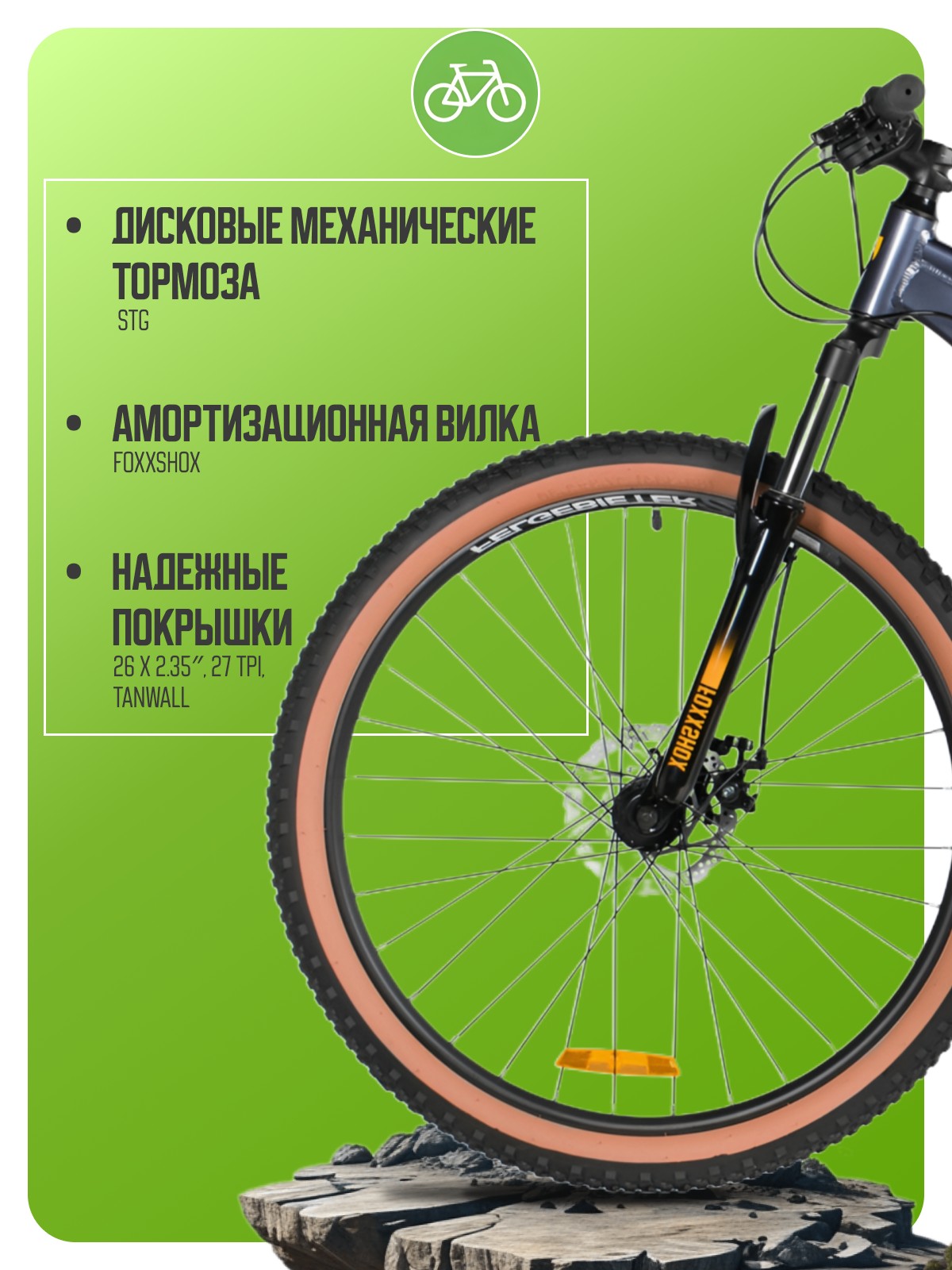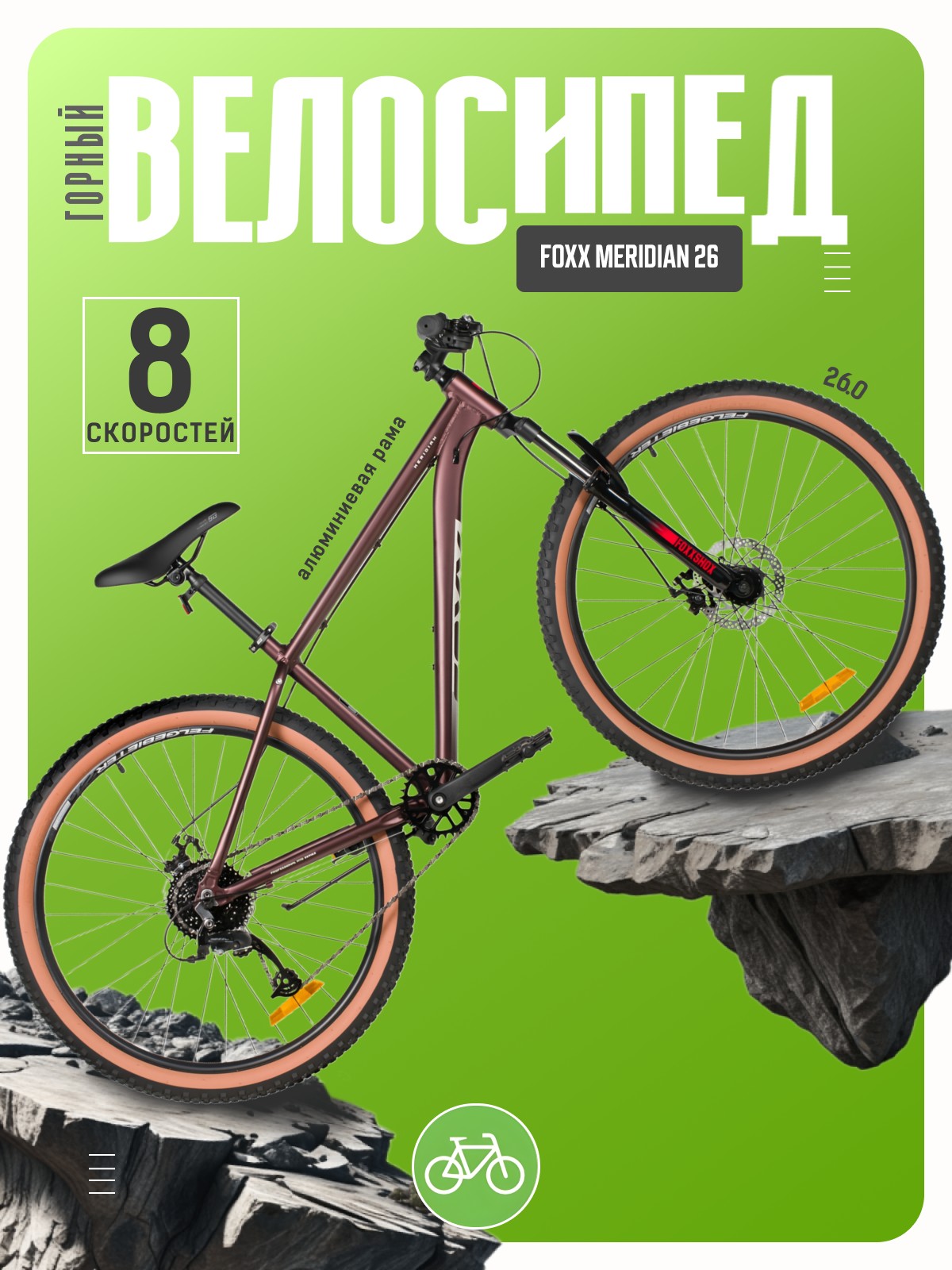 Горный велосипед для начинающих с навесным оборудованием Microshift, 8 скоростей. Технические особенности: легкая алюминиевая рама (сплав 6061-T6, частично скрытая проводка, кареточный стакан BSA, крепление калипера IS, прямой рулевой стакан, съемный петух, бонки для багажника и флягодержателя), амортизационная вилка Foxxshox (пружинная, ход 50 мм, диаметр ног 28.6 мм, стальная с алюминиевой короной), двойные алюминиевые обода Felgebeiter VB-18 (под AV ниппель), дисковые механические тормоза STG (роторы 160/140 мм, крепление на 6 болтов), подножка. Подходит для прогулочной езды по различным дорогам и пересеченной местности. Диаметр колес - 26 дюймов. Вес - 14,8 кг.