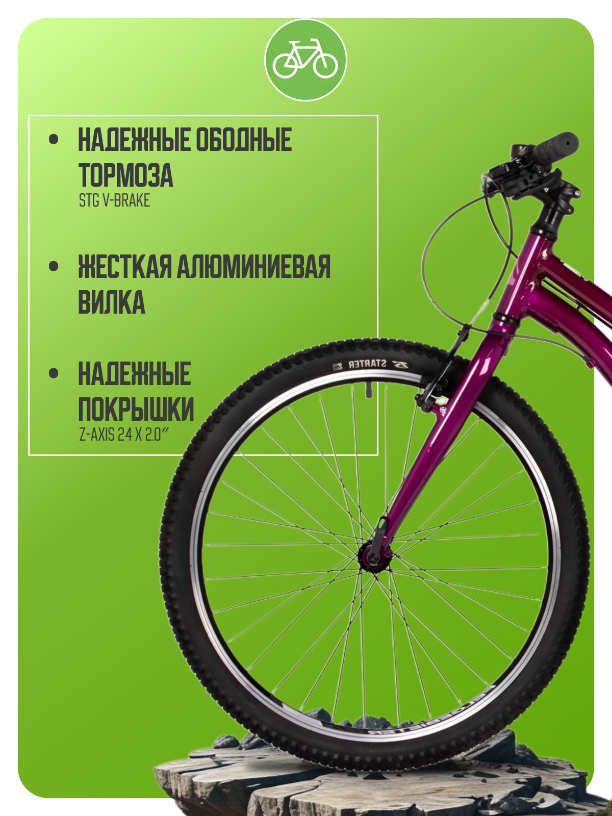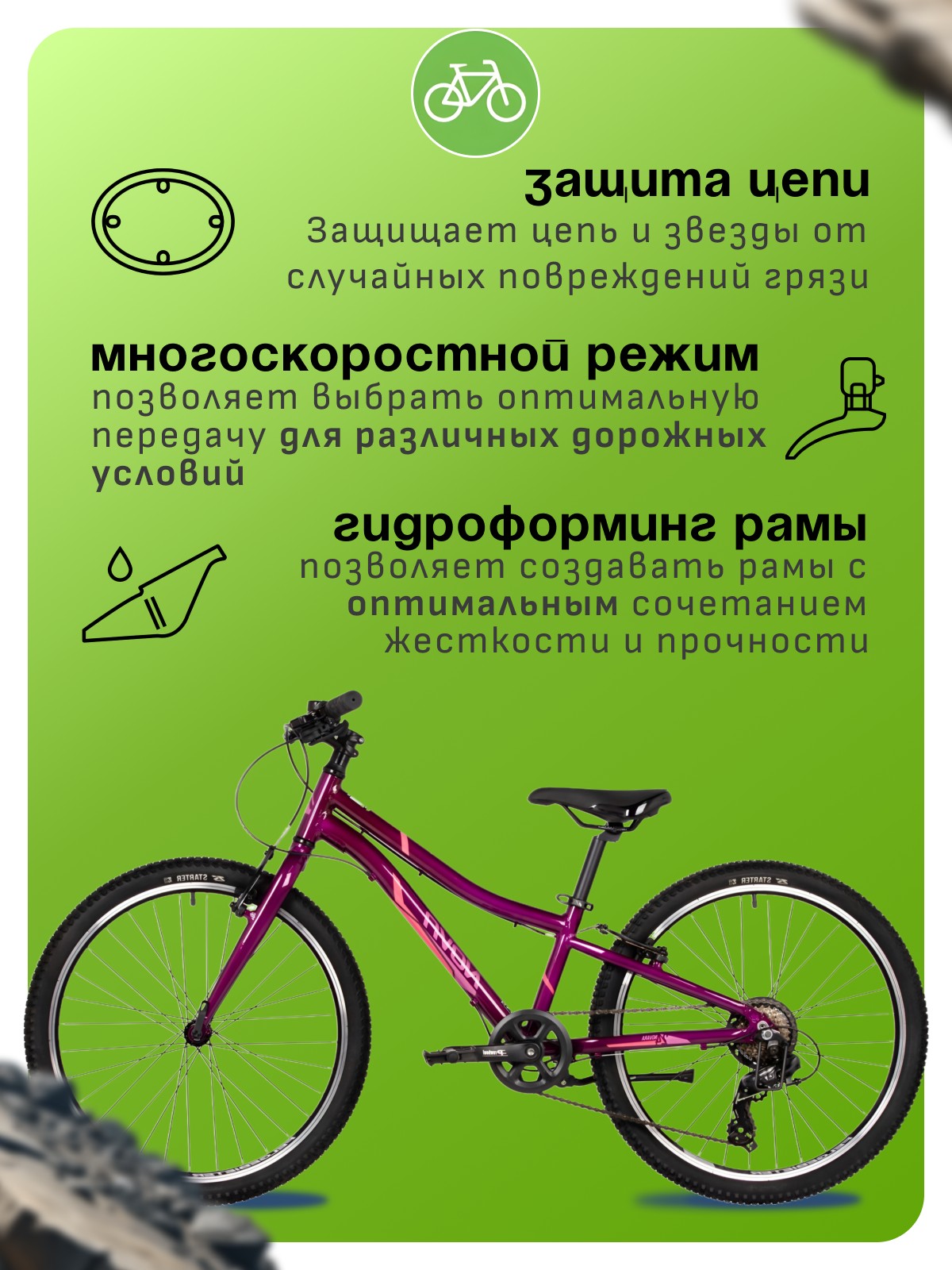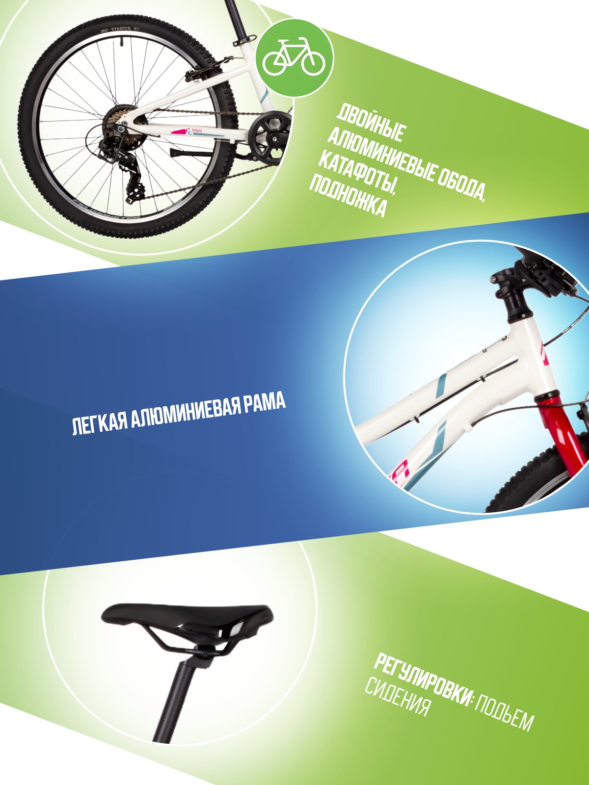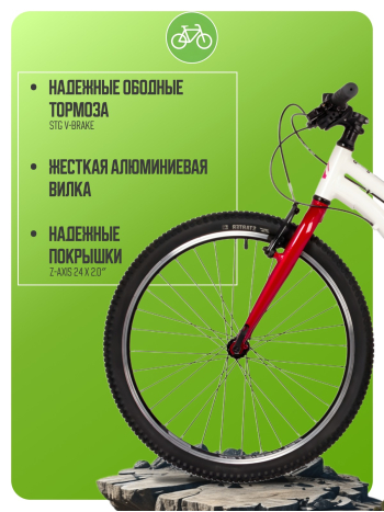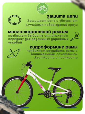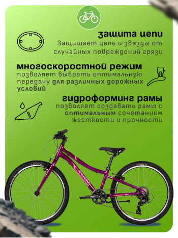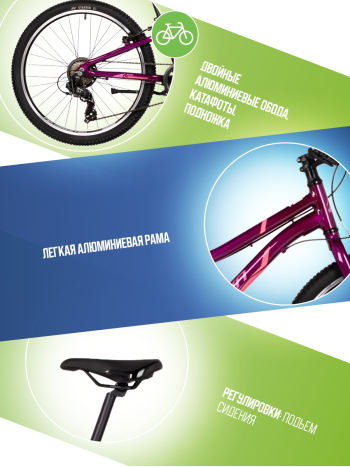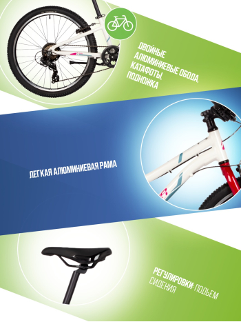 Подростковый велосипед для девочек с оборудованием начального класса Shimano, 6 скоростей. Технические особенности: легкая алюминиевая рама (открытая проводка, кареточный стакан BSA, прямой рулевой стакан, съемный петух), жесткая алюминиевая вилка, двойные алюминиевые обода (под ниппель AV), надежные ободные тормоза STG V-Brake, защита цепи, защита заднего переключателя, подножка, катафоты. Подходит для прогулочной езды по ровным дорогам и по несложной пересеченной местности. Диаметр колес - 24 дюйма. Вес - 13 кг.