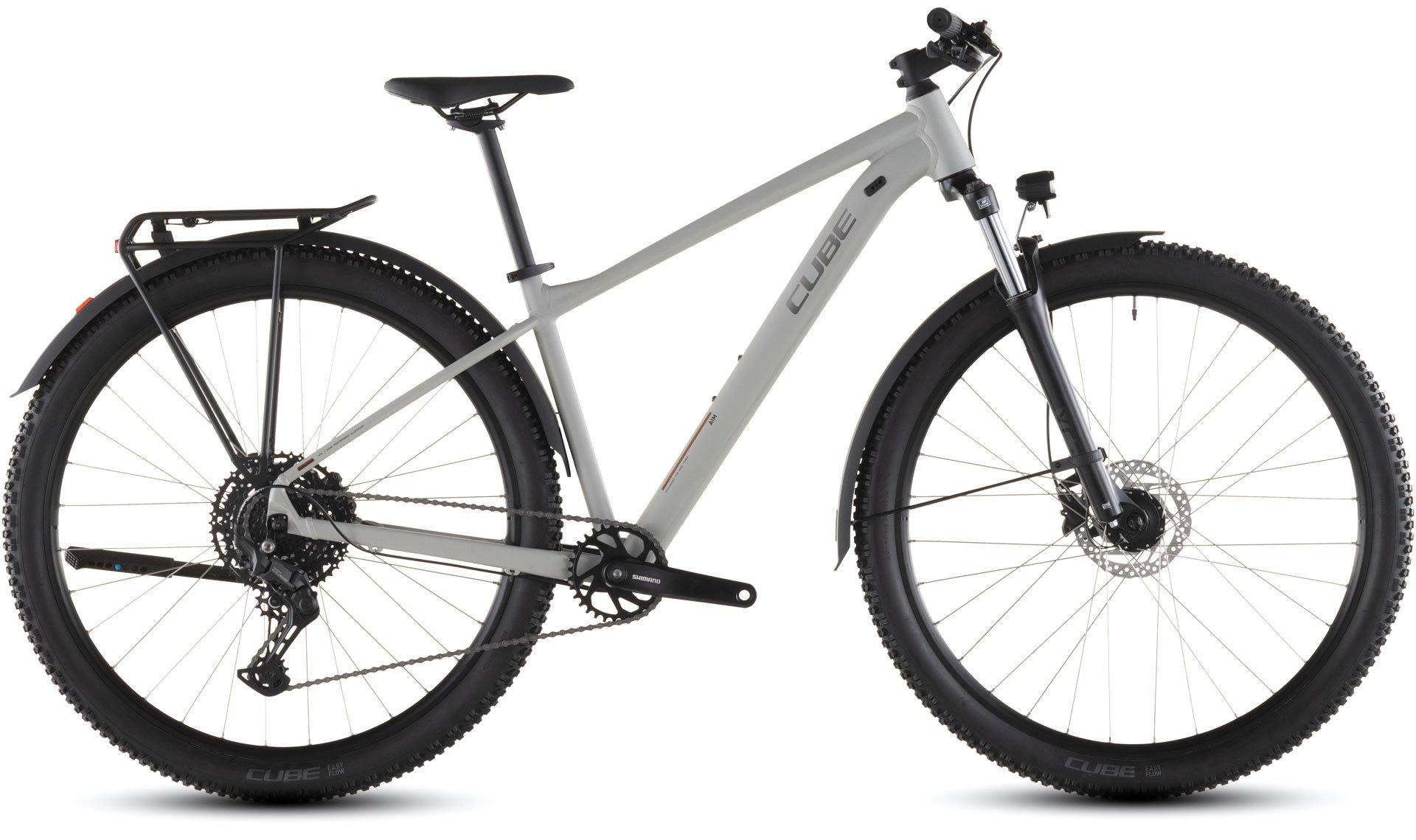 Легкий хардтейл для езды в стиле кросс-кантри с оборудованием высшего любительского класса Shimano, 10 скоростей. Технические особенности: алюминиевая рама Aluminium Lite (двойной баттинг, гидроформинг, скрытая проводка, сглаженные швы, крепление для подножки), амортизационная вилка SR Suntour XCT (пружинно-эластомерная, ход 100 мм), двойные алюминиевые обода CUBE EX25, дисковые гидравлические тормоза Shimano BR-MT200/UR300 (роторы 160/160 мм), подножка, крылья, багажник, фонарь, звонок. Подходит для активной езды по различным дорогам и пересеченной местности. Диаметр колес - 29 дюймов. Вес - 14,3 кг.
