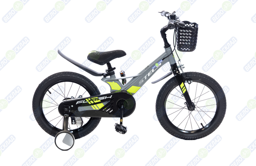 Велосипед, предназначенный для детей в возрасте от трех до шести лет, без переключения передач. Технические особенности: легкая рама из магниевого сплава (скрытая проводка), жесткая вилка из магниевого сплава (крепление калипера IS), одинарные стальные обода (под AV ниппель), передний тормоз - ободной клещевой, задний тормоз - барабанный (роллерный), полная защита цепи, пластиковые крылья, съемные боковые колеса, передняя корзинка, звонок. Подходит для обучения и прогулочного катания в городских условиях. Диаметр колес - 16 дюймов. Вес - 8,5 кг.