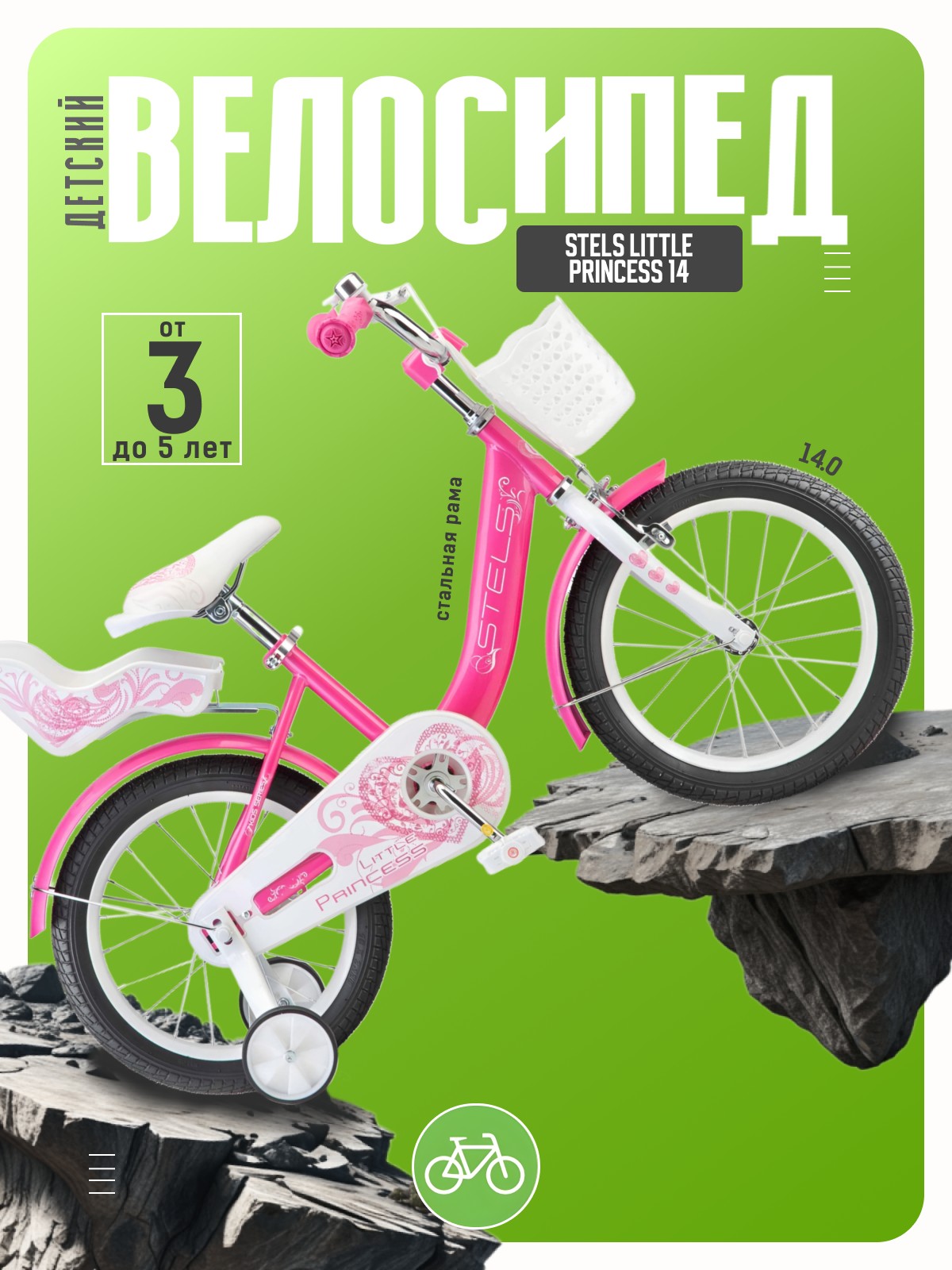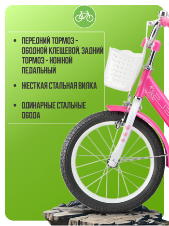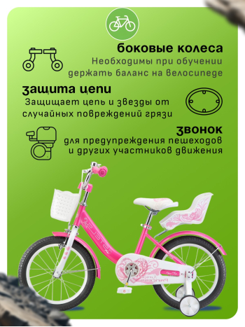 Велосипед, предназначенный для девочек в возрасте от двух до четырех лет, без переключения передач. Технические особенности: прочная стальная рама, жесткая стальная вилка, одинарные стальные обода (под AV ниппель), передний тормоз - ободной клещевой, задний тормоз - ножной педальный, полная защита цепи, полноразмерные крылья, съемные боковые колеса, передняя корзина, сиденье для куклы, звонок. Подходит для обучения и прогулочного катания в городских условиях. Диаметр колес - 14 дюймов. Вес - 9,4 кг.