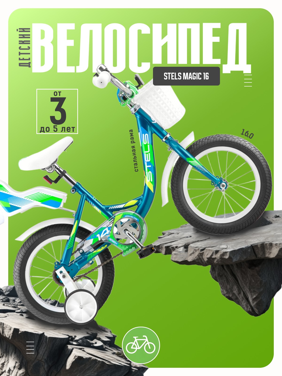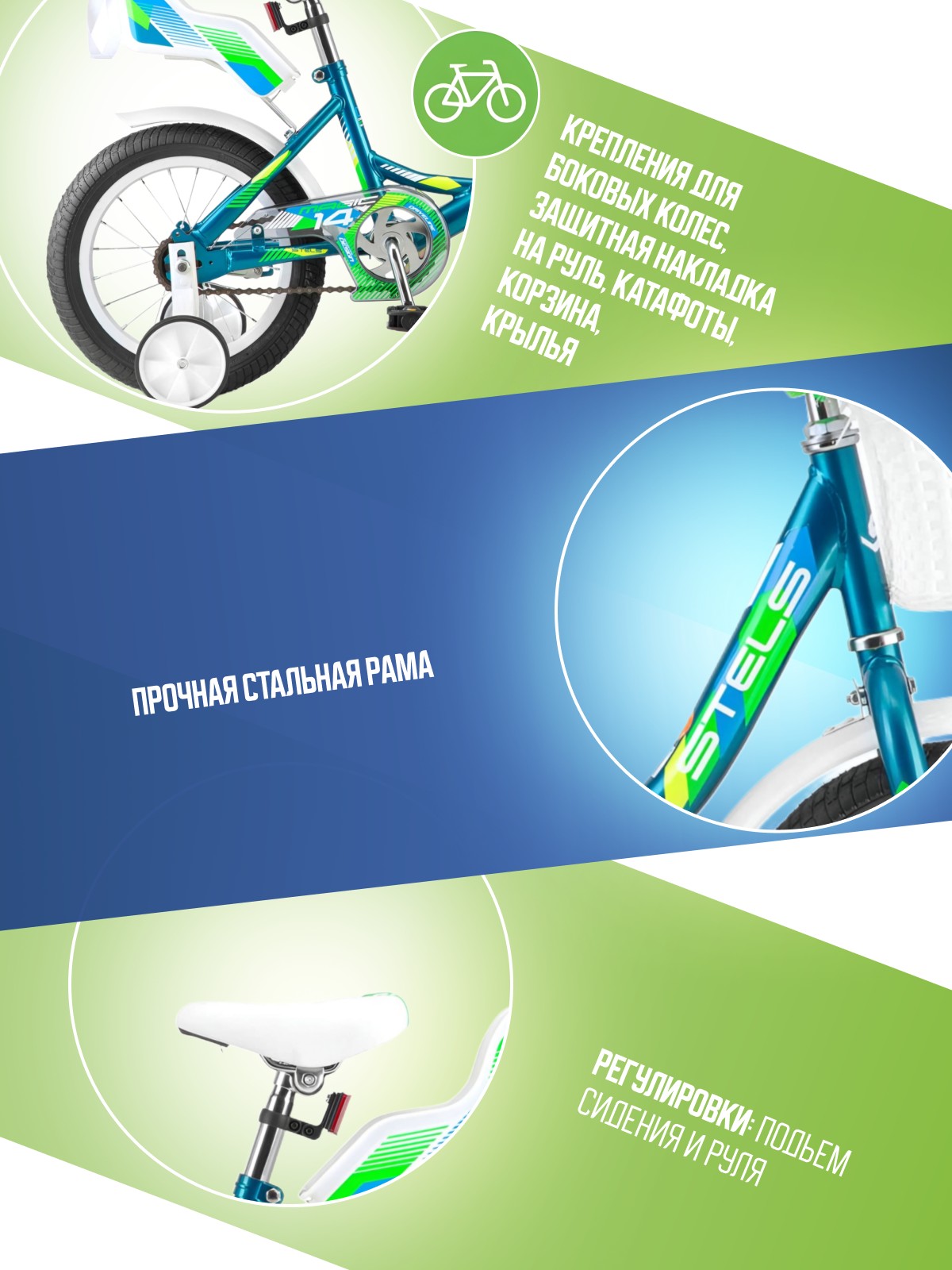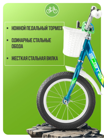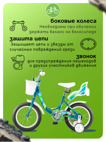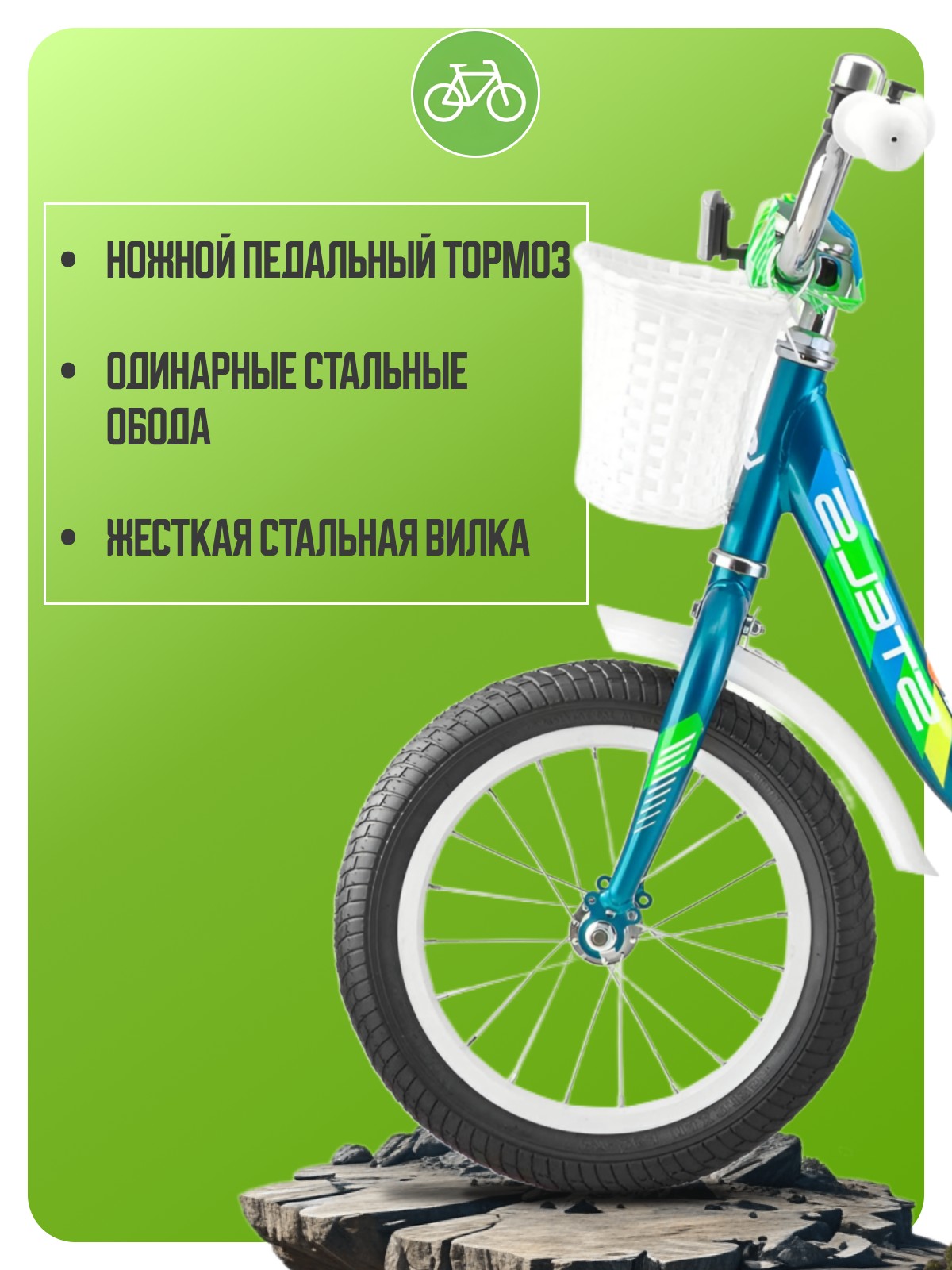Велосипед, предназначенный для детей в возрасте от трех до шести лет, без переключения передач. Технические особенности: прочная стальная рама, жесткая стальная вилка, одинарные стальные обода (под AV ниппель), ножной педальный тормоз, пластиковая защита цепи, крылья, съемные боковые колеса, передняя корзина, сиденье для куклы, катафоты, звонок. Подходит для обучения и прогулочного катания в городских условиях. Диаметр колес - 16 дюймов. Вес - 10,8 кг.